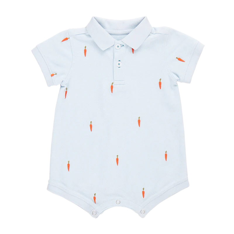 Hop into Easter style! The sweetest little embroidered carrots are sprouting on our Baby Boys Alec Jumper. Your little bunny will look darling in this short-sleeved one-piece, crafted in a classic sky blue pique. Details include a 3/4 button closure at the front collar, soft ribbing at the arms and thighs and our signature bright blue thread detail on the top button. Ring snap closure at the legs allows for easy diapering. Match with the Boys Alec shirt in Carrot Embroidery for a buttoned up big brother / little brother look.