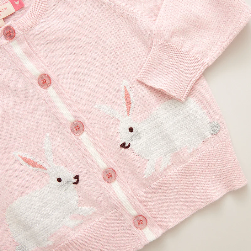 Some bunnies to love! Two is better than one when it comes to the adorable cottontails ready to hop right into your heart from our Baby Girls Maude Rabbit Sweater. A shimmery chenille tail and silvery thread throughout really brings our bunnies to life. A crisp white stripe down the button placket highlights our signature pink glitter buttons and hand embroidered eyes and whiskers give these little thumpers a cheeky wink and a smile. Wear over any of our fabulous Easter dresses and bubbles for a whimsical warm-up.