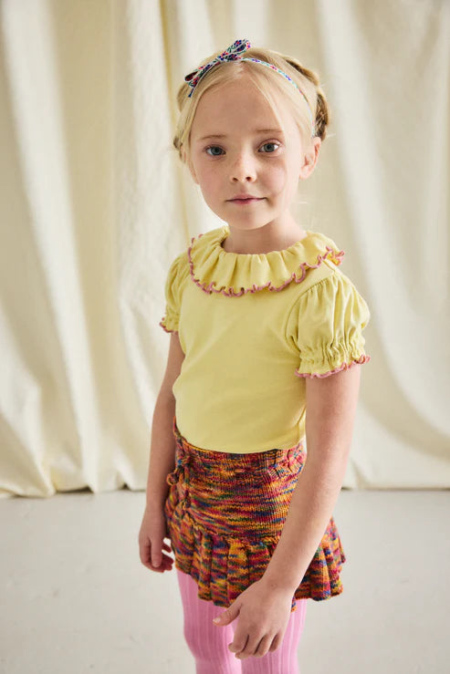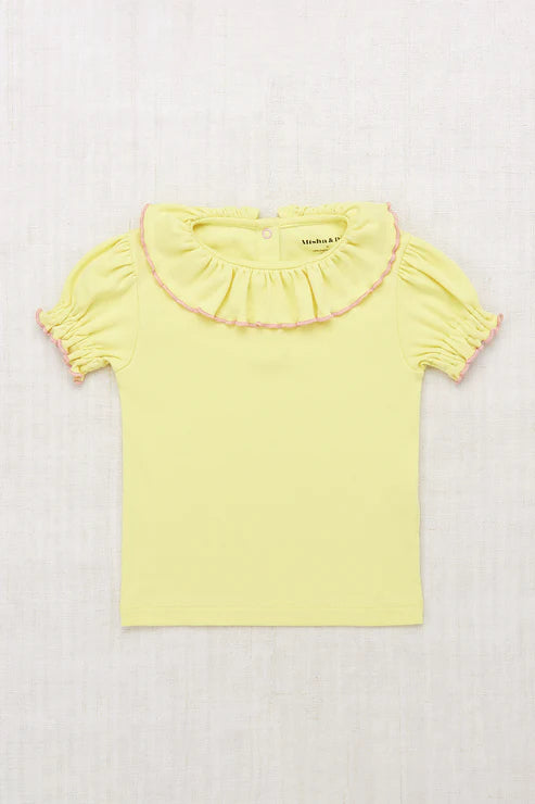 A classic short-sleeved slim-fit top in Pima cotton, featuring a gathered ruffle neck and a soft elasticated ruffle cuff with contrast merrowed edges, and a snap closure at the back neck.