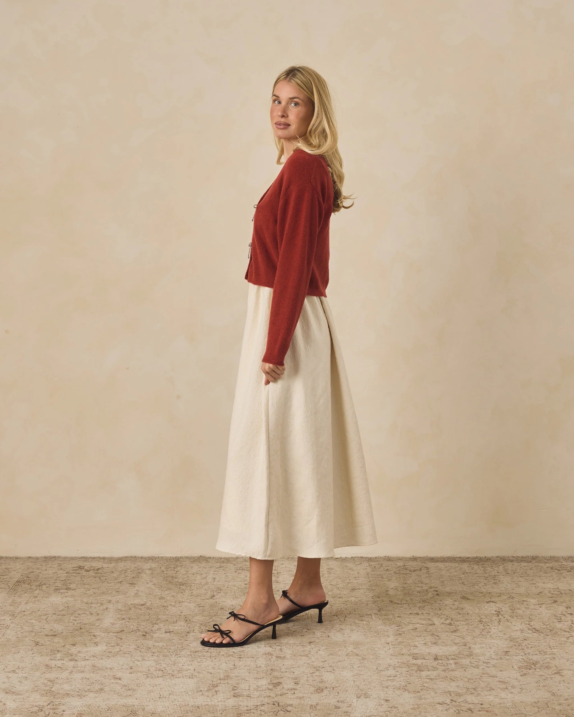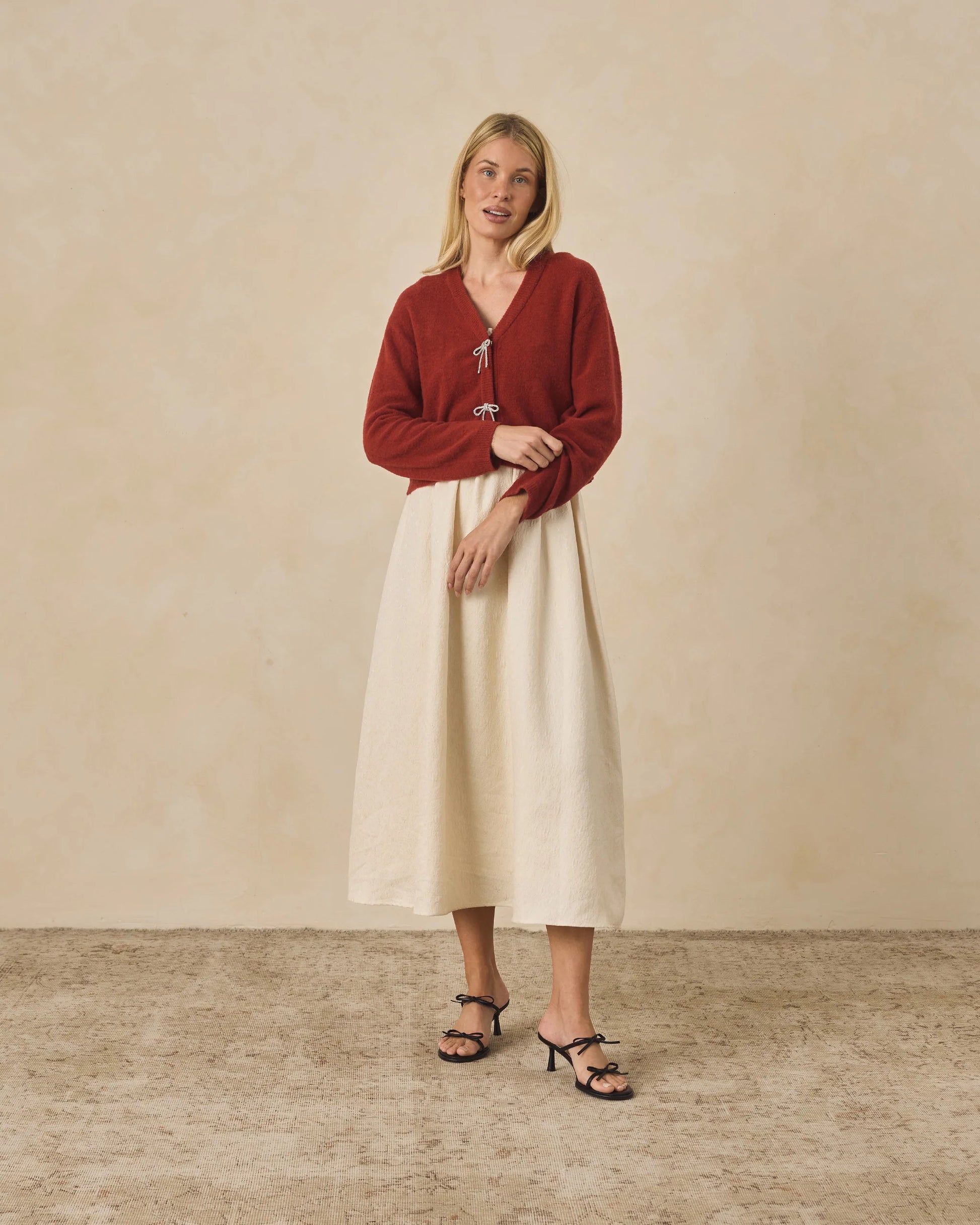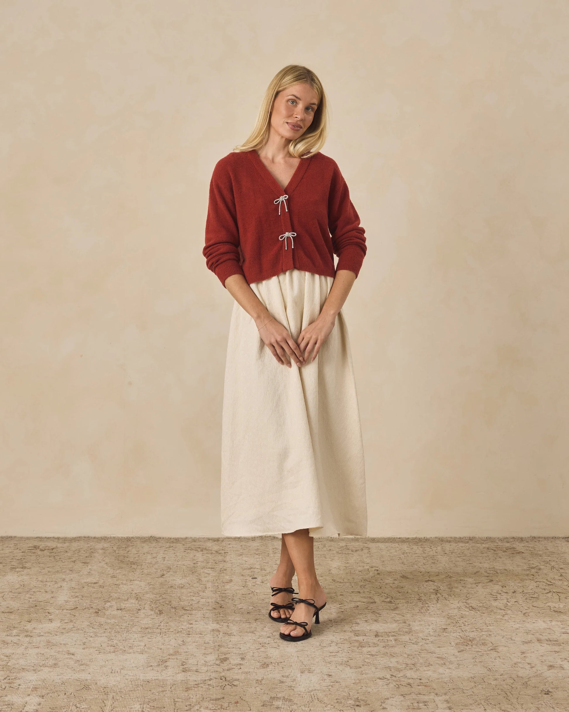 The Bow Cardigan is a sweet layering piece featuring a classic knit body with delicate bow details down the front. Designed for both comfort and charm, it pairs beautifully with holiday dresses or can be worn as a cozy statement piece on its own.