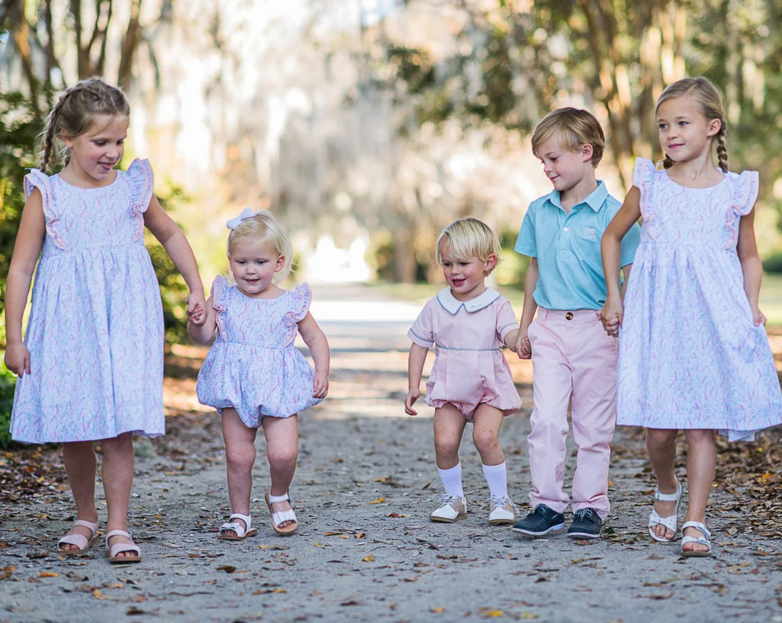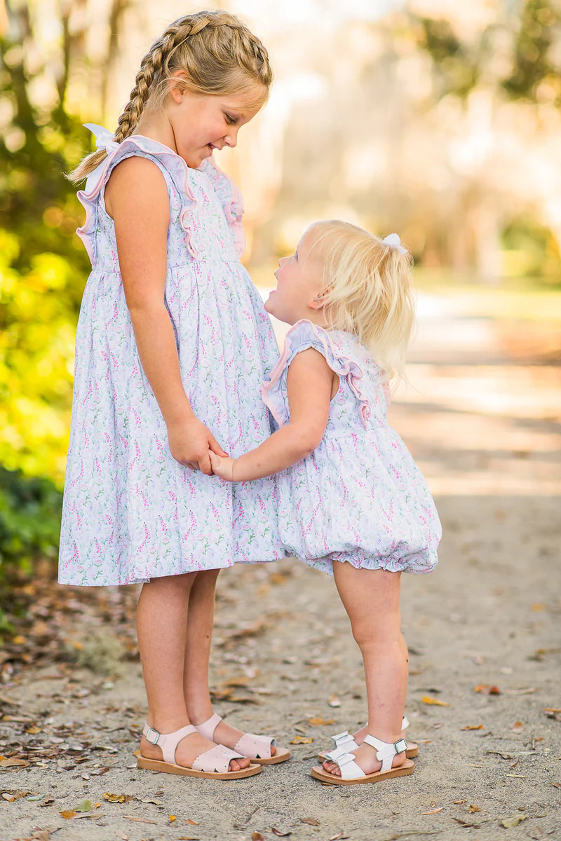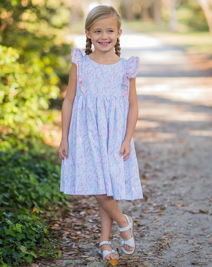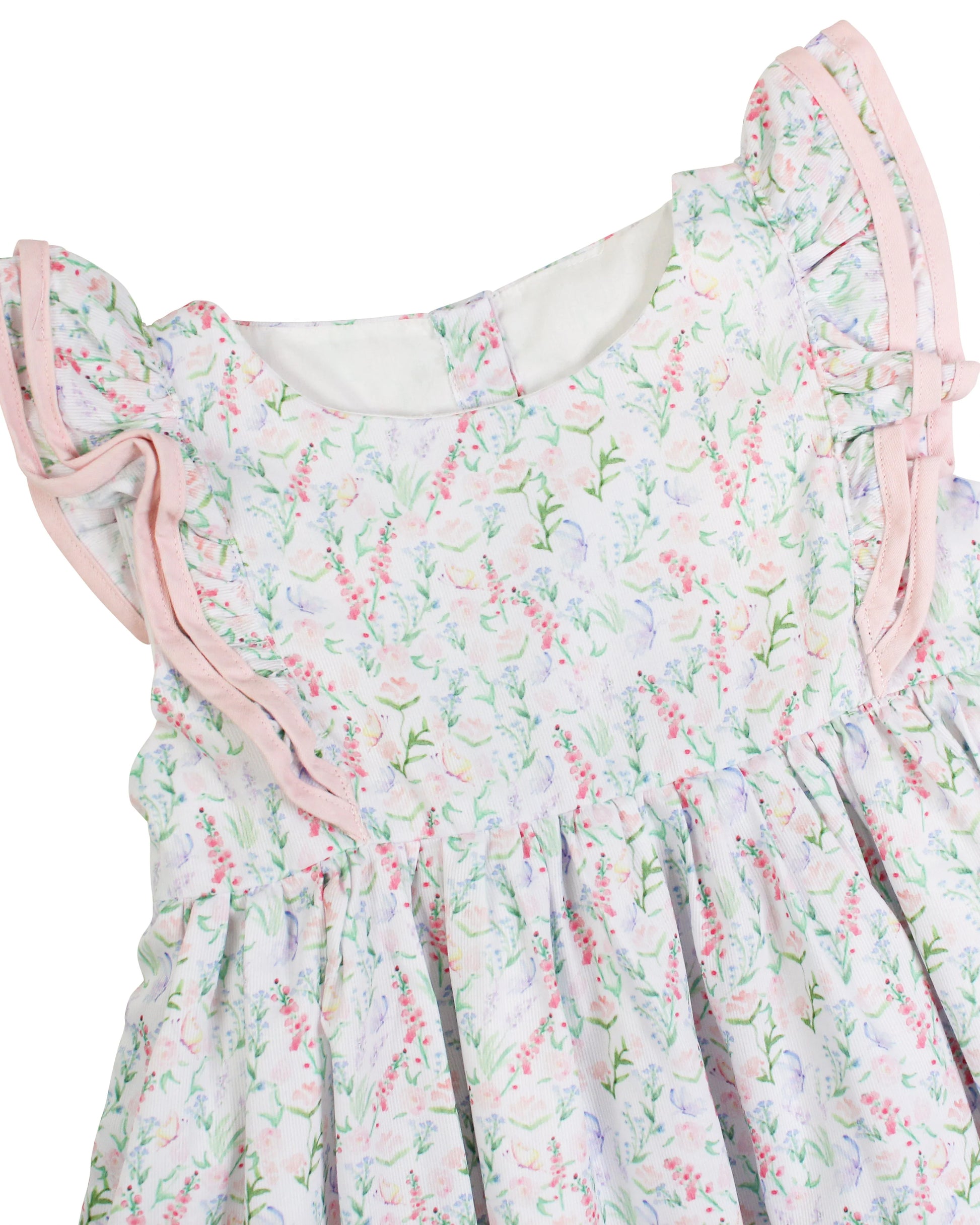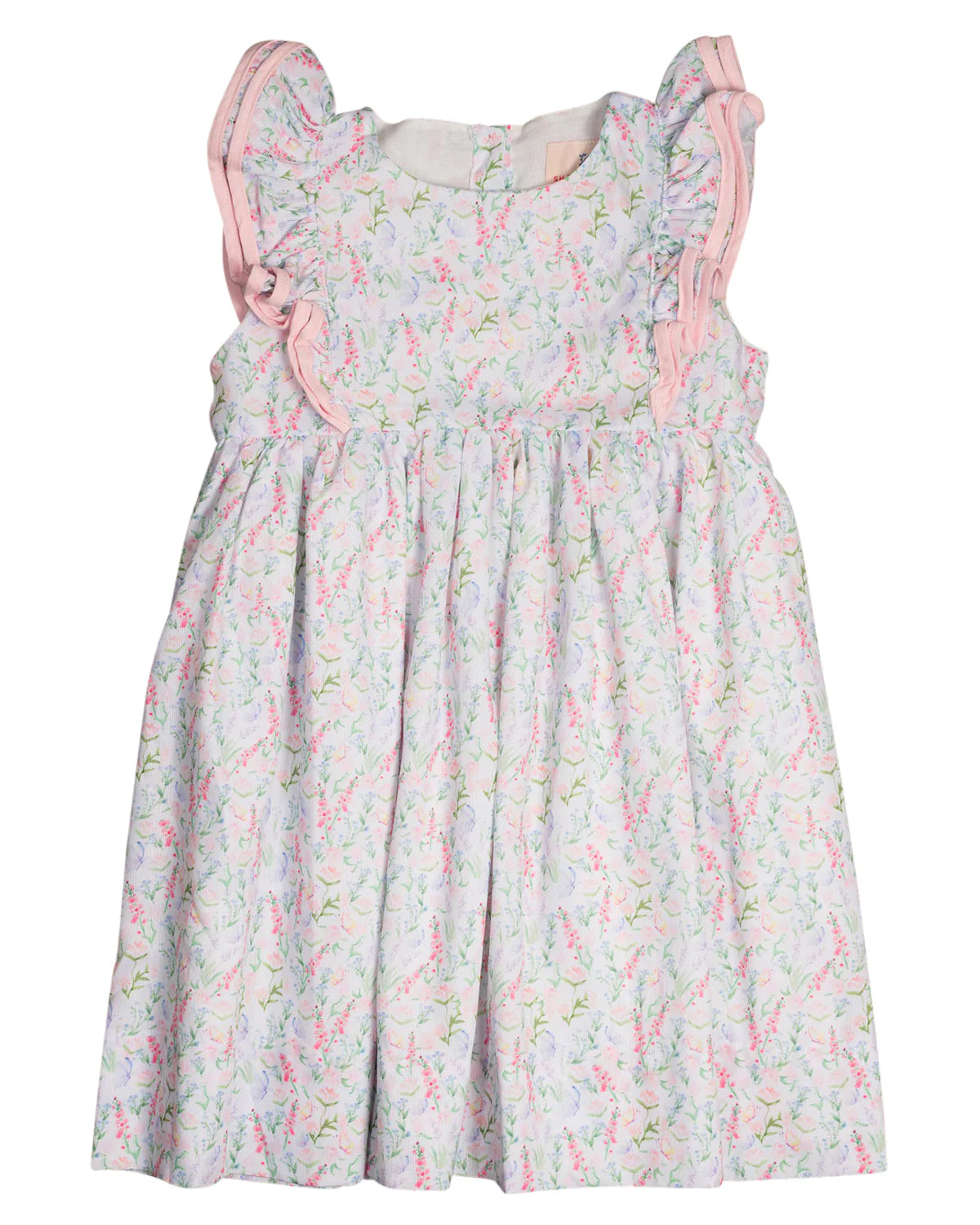 Smockingbird exclusive hand painted print is the perfect addition to any springtime wardrobe. Fully lined, mother of pearl buttons down the back, and a flutter ruffle sleeve give this dress that whimsical touch. 100% cotton.