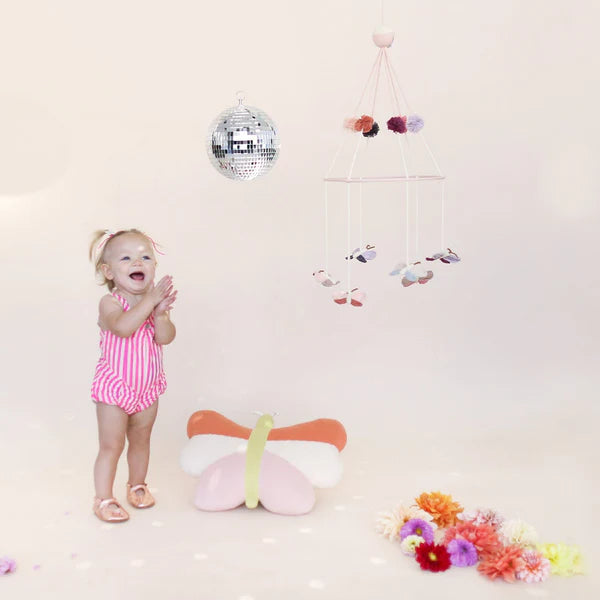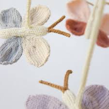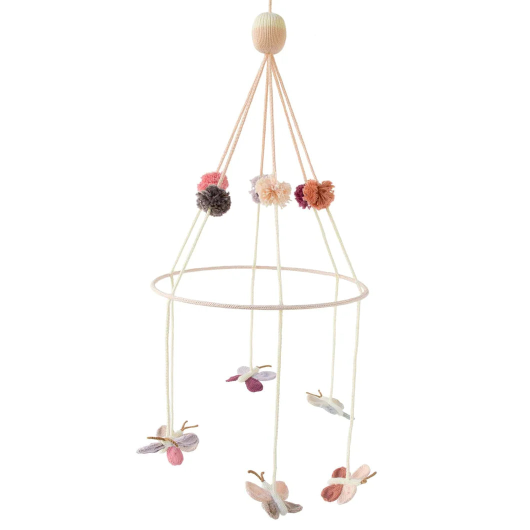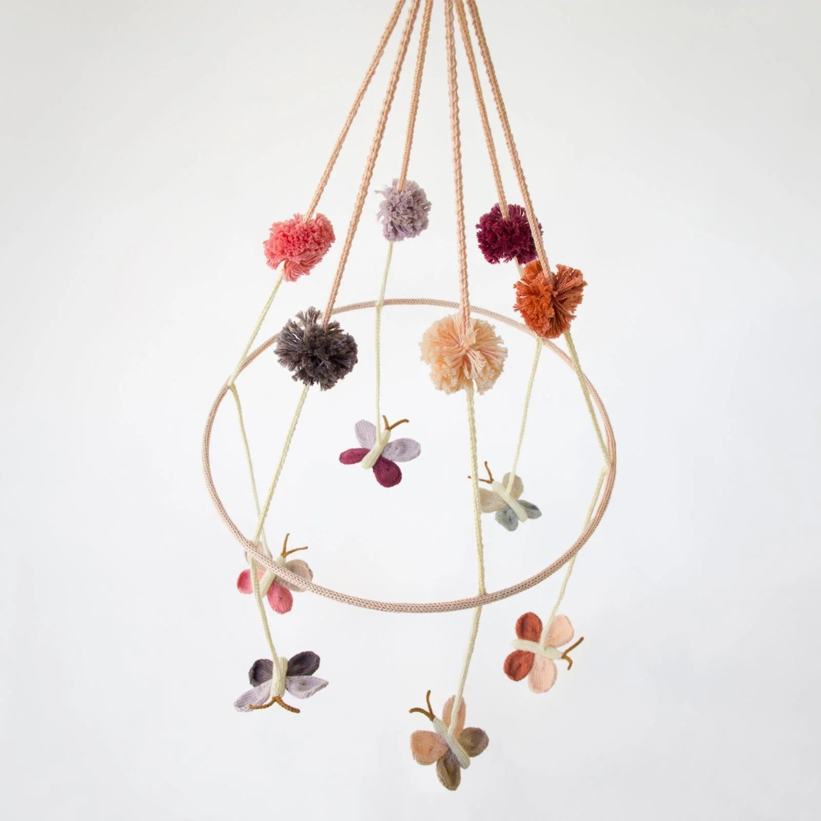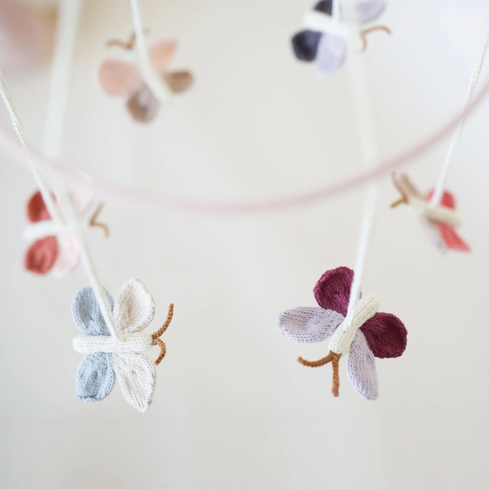 Whimsical hand knit design with little pastel butterflies and sweet details. This beautiful mobile can be placed over a crib, changing table, or any corner of a room. Little ones will be mesmerized as the butterflies gently "flutter" and rotate with the slightest breeze. Create an enchanting atmosphere in your baby's room.