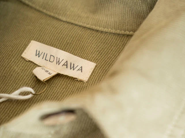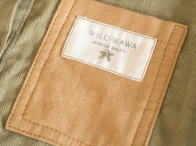 Hand-embroidered Wild Wawa fabric label sewn on the pocket