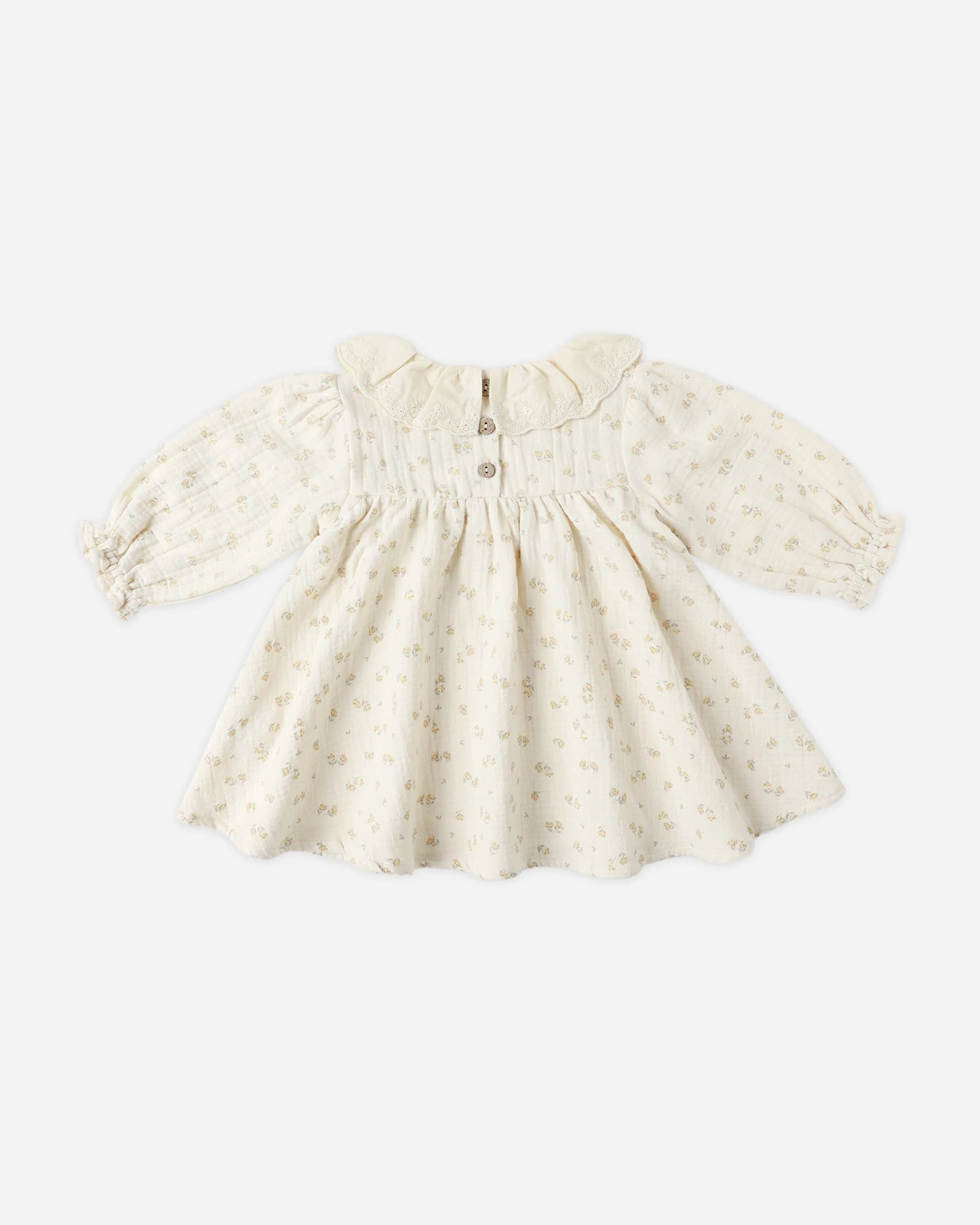 Our Callie Dress features a darling eyelet collar, smocked front bodice, gathered skirt, and ruffle sleeves, with buttons at the back for easy dressing. Matching bloomers included with all sizes.