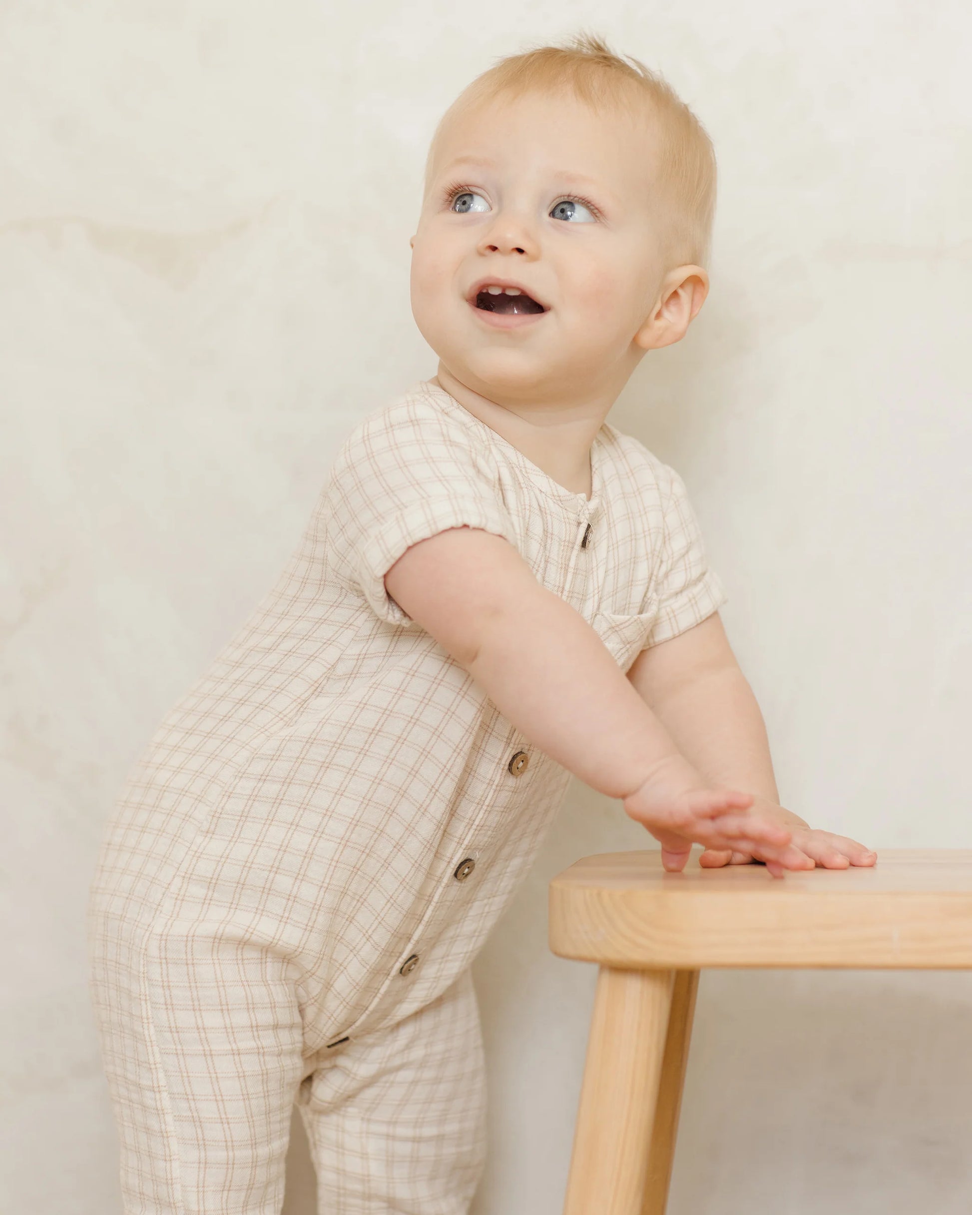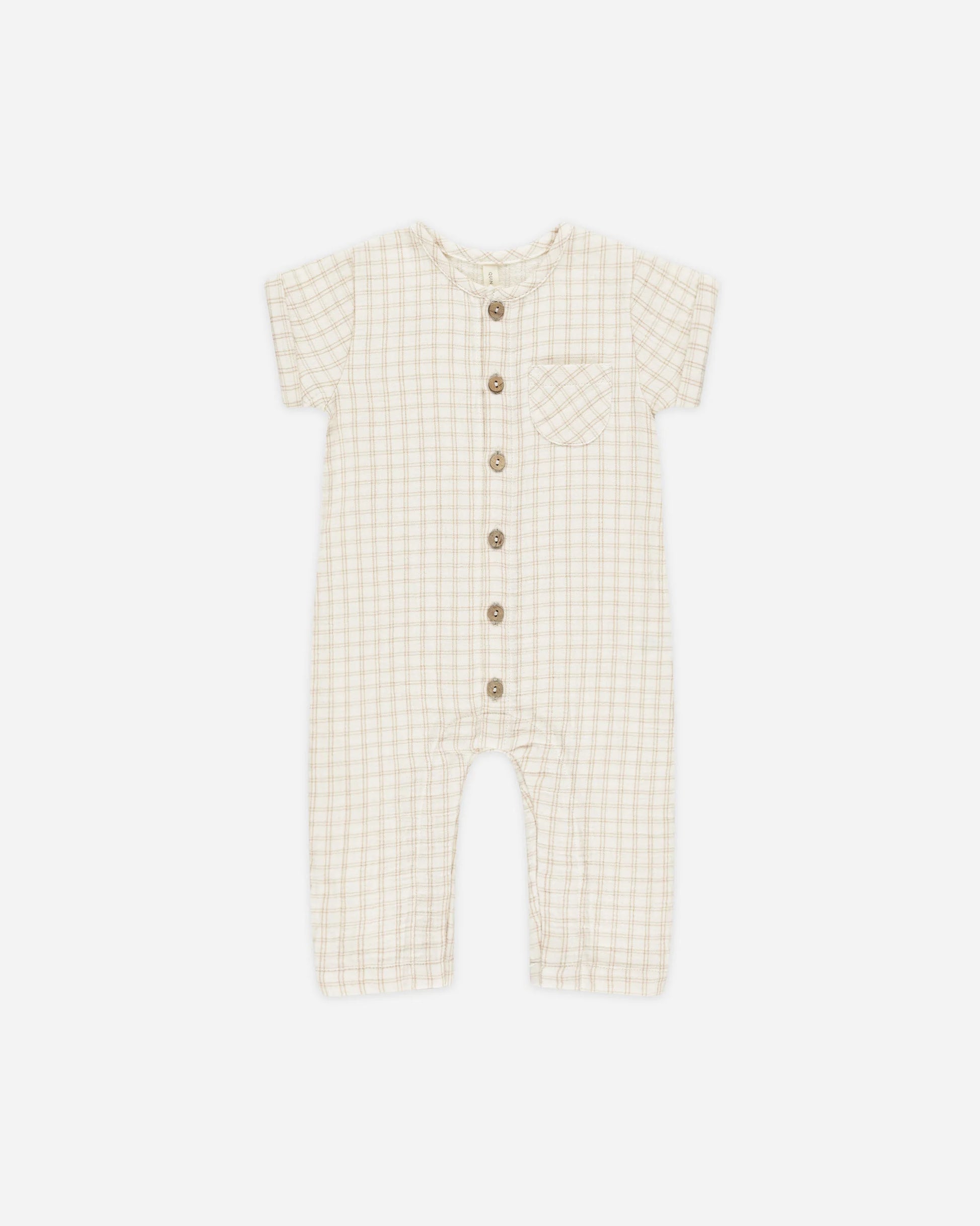 Short sleeve one-piece jumpsuit with front buttons and bottom snaps for an easy breezy fit.