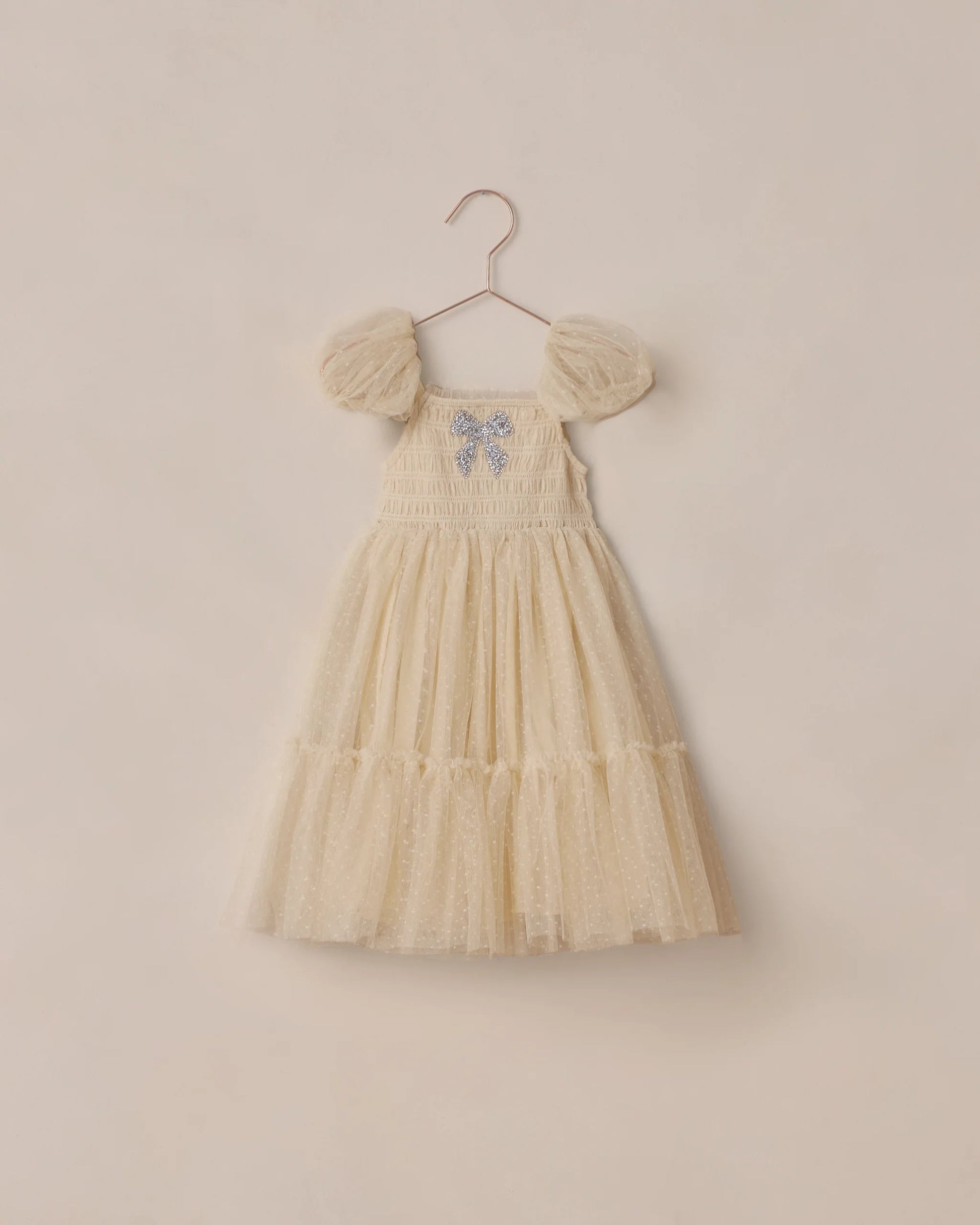 Our Clara Dress, crafted from delicate swiss dot tulle, features a smocked bodice adorned with a charming bow appliqué, bubble cap sleeves, and a full, tiered skirt for a whimsical, twirl-worthy look.