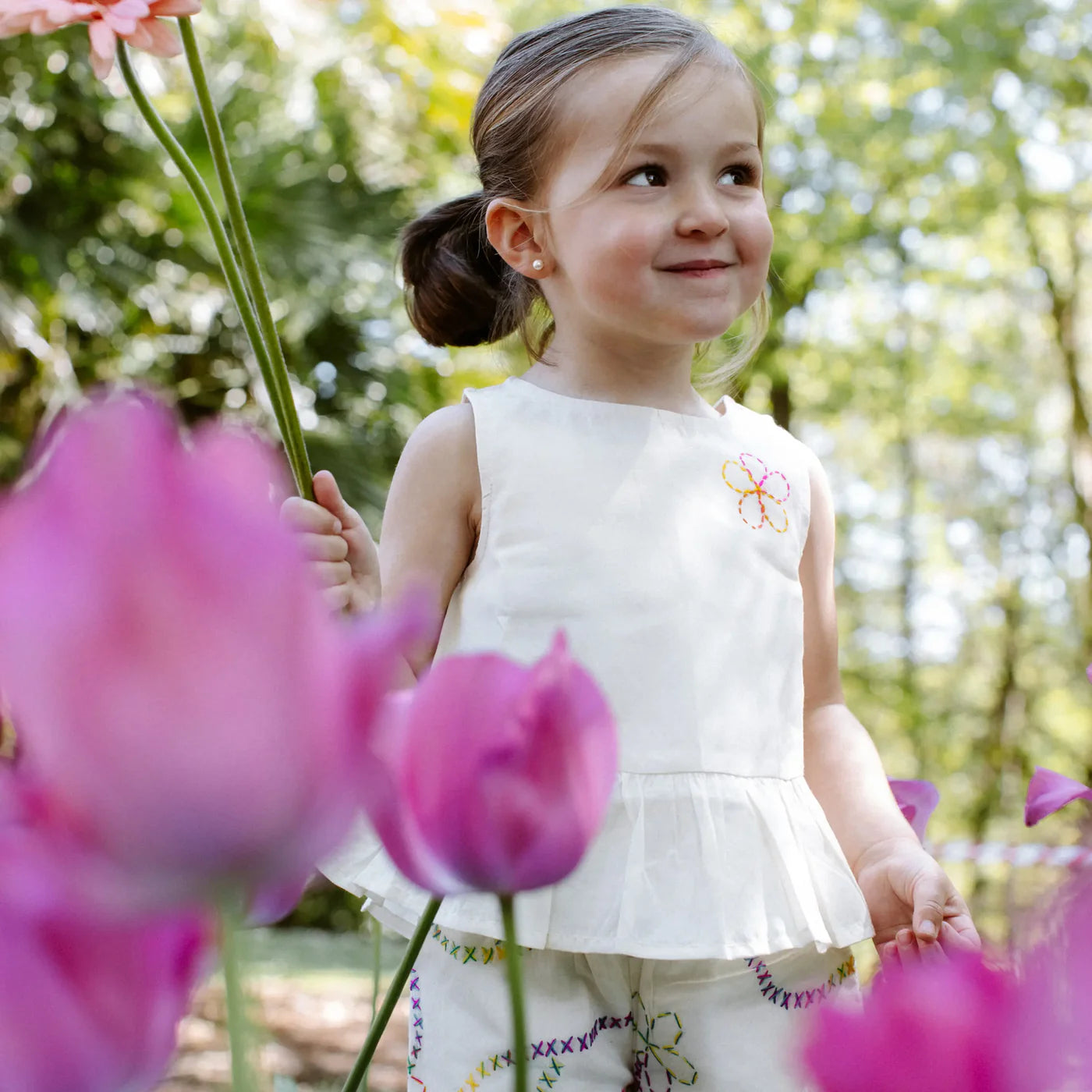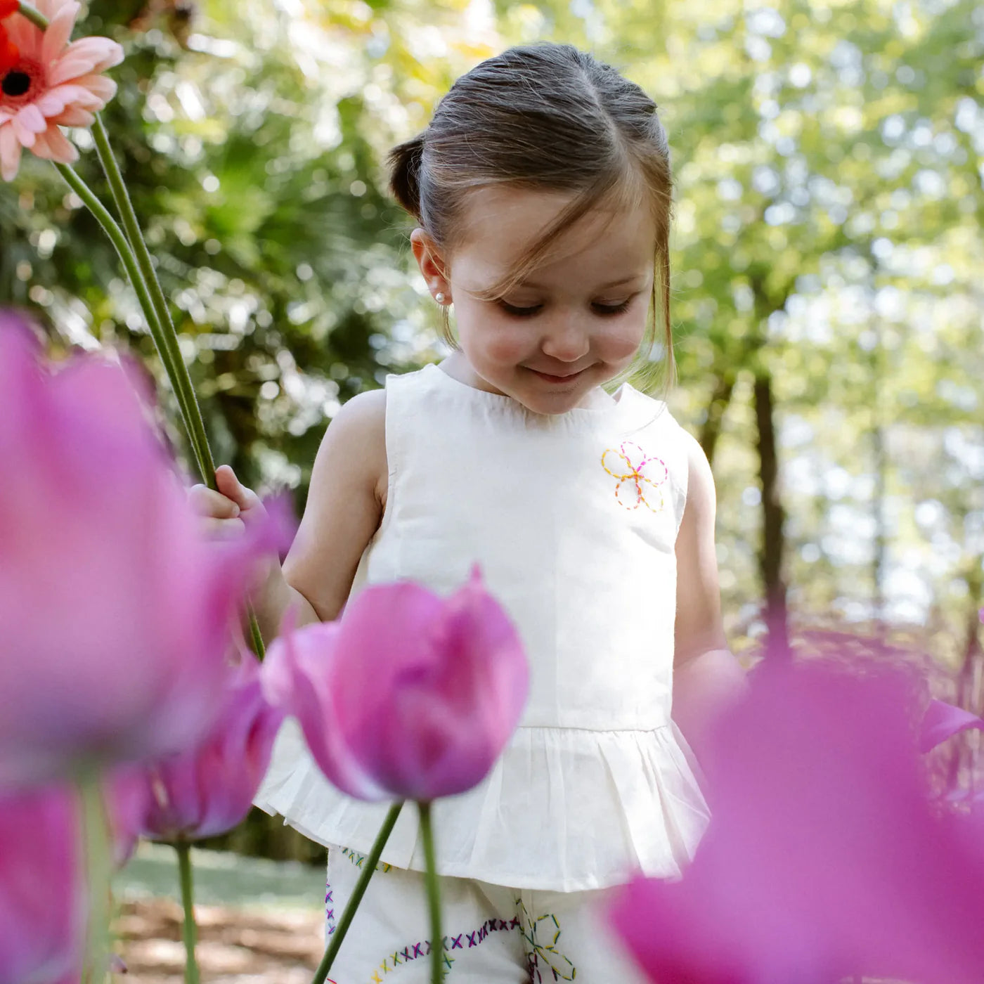 - The White Color Jardin Top and Shorts Set features colorful handmade flowers and bees embroidery inspired by kids' drawings.