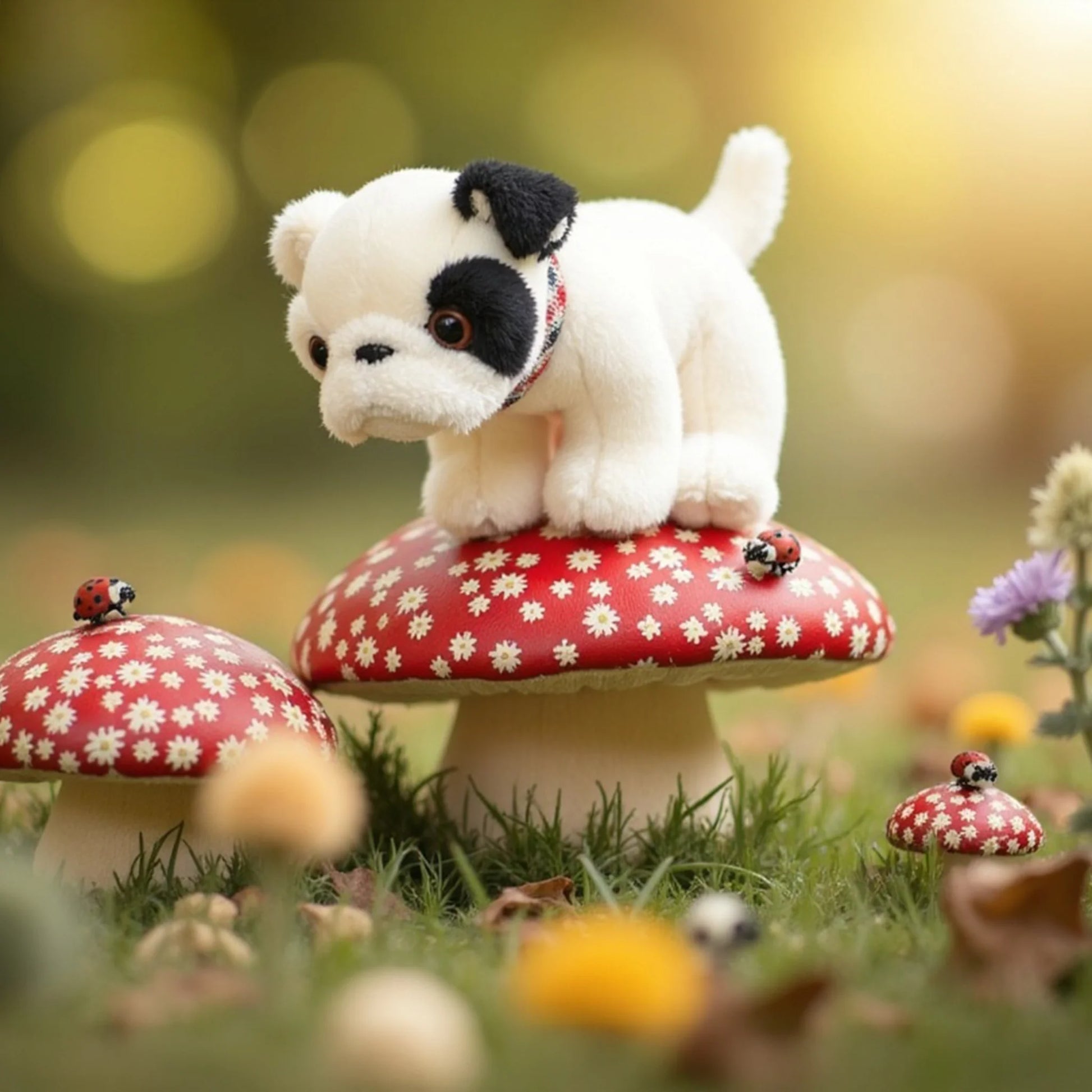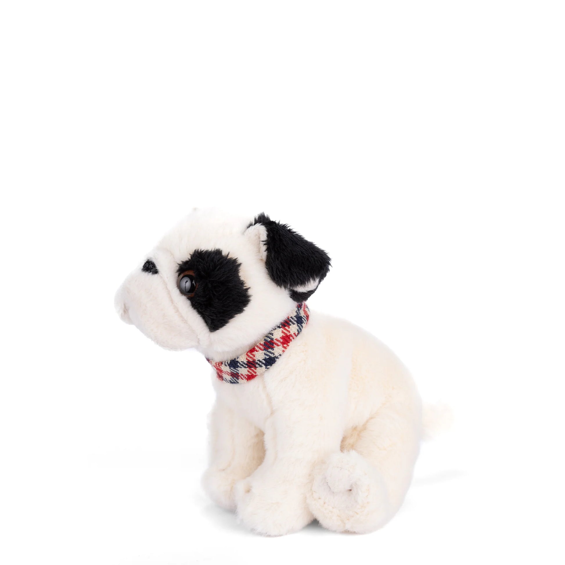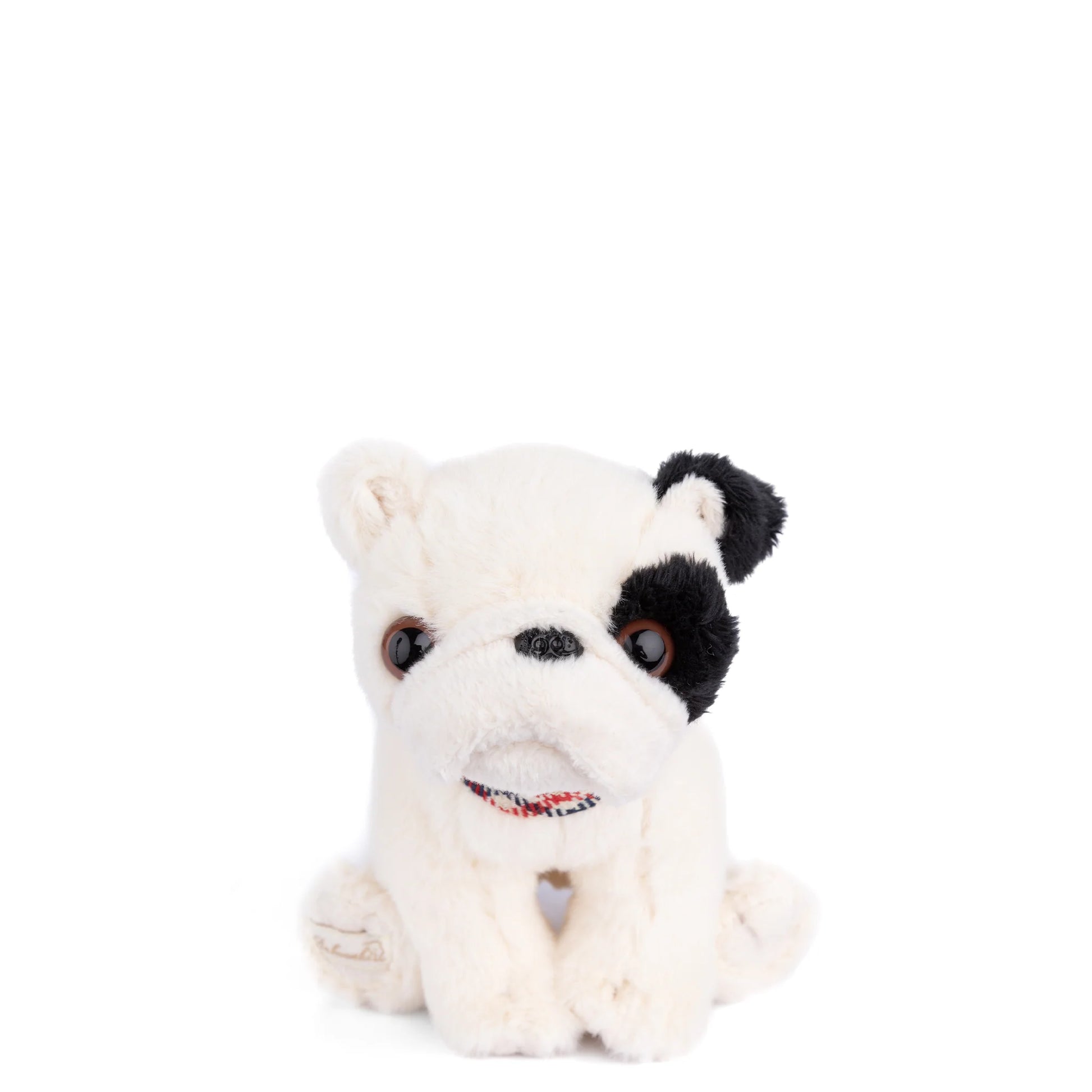 Say hello to Baby Gentleman, the plush bulldog puppy with a heart of gold. This little guy has soft white fur, a black spot on his eye, and a cute wagging tail. Begin and end all your adventures with your new best puppy friend.