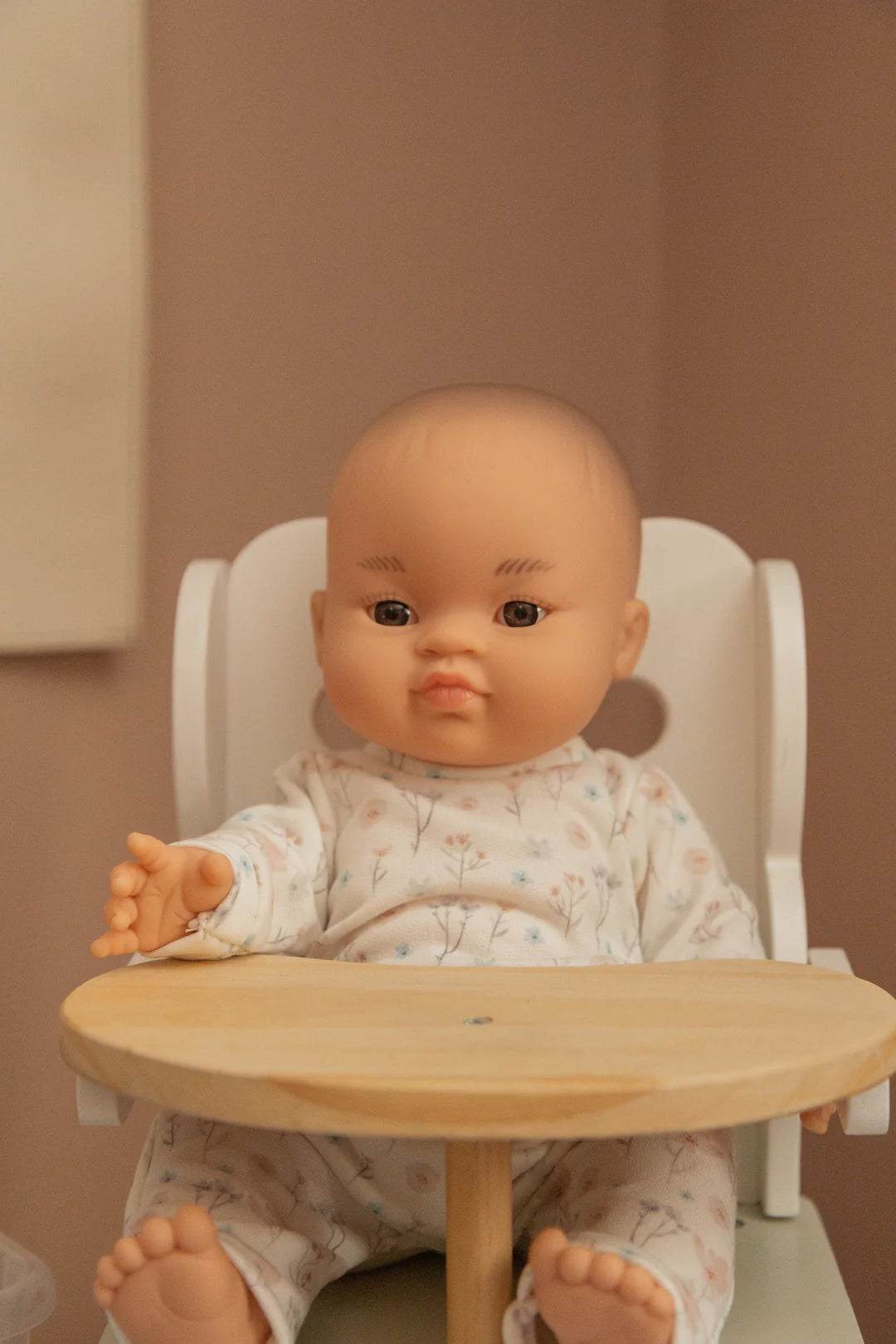 - Clothing included (floral patterned sweater and pants set and pink headband)