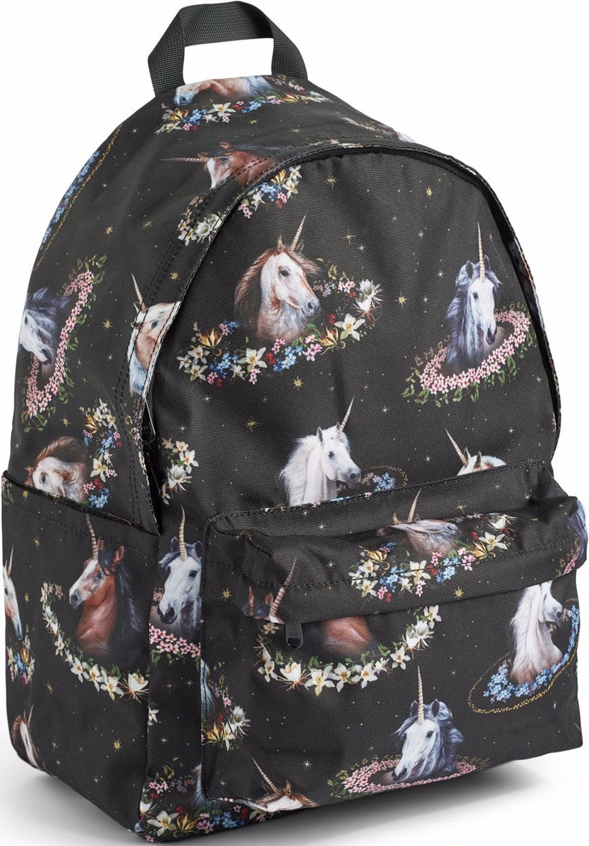 Black backpack with a mystical unicorn and flower print. The backpack has plenty of storage space, including a padded pocket that protects your computer or tablet. It features a zippered front pocket, bottle pockets on both sides, and padded back and shoulder straps. Additionally, it has an adjustable chest strap that helps evenly distribute the weight. The backpack measures 30 x 17 x 42 cm and has a volume of 21L.