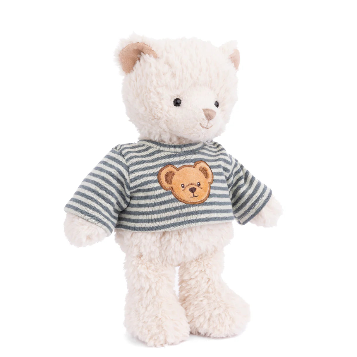Jonas is a cuddly plush bear with soft cream-colored fur and a friendly stitched face. He wears a blue-and-white striped shirt featuring an embroidered bear face for a playful touch. With his classic design and huggable feel, Jonas is a delightful companion for snuggles, play, or display.