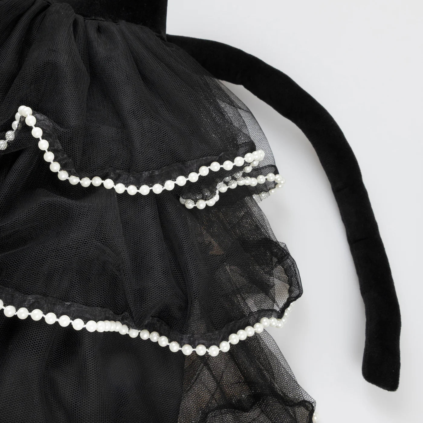 Meow! There's a chic cat on the prowl! Our clever designers' attention to detail make this Halloween cat costume purr-fectly stylish! The black tulle skirt features faux pearls and a clip-off tail, so you can wear it beyond costume parties or dress-up fun The black velvet headband, with a statement bow and faux pearl accents, is just as endearing - and also doubles as cat ears to complete the fancy feline look.