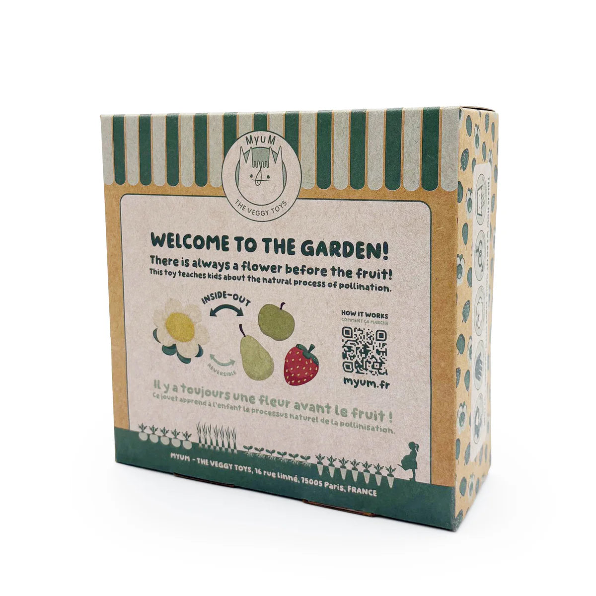 Shaped like a flower, it transforms into a strawberry... By manipulating it, the child stimulates their motor skills and learns that before the strawberry, Mother Nature offers a little flower.