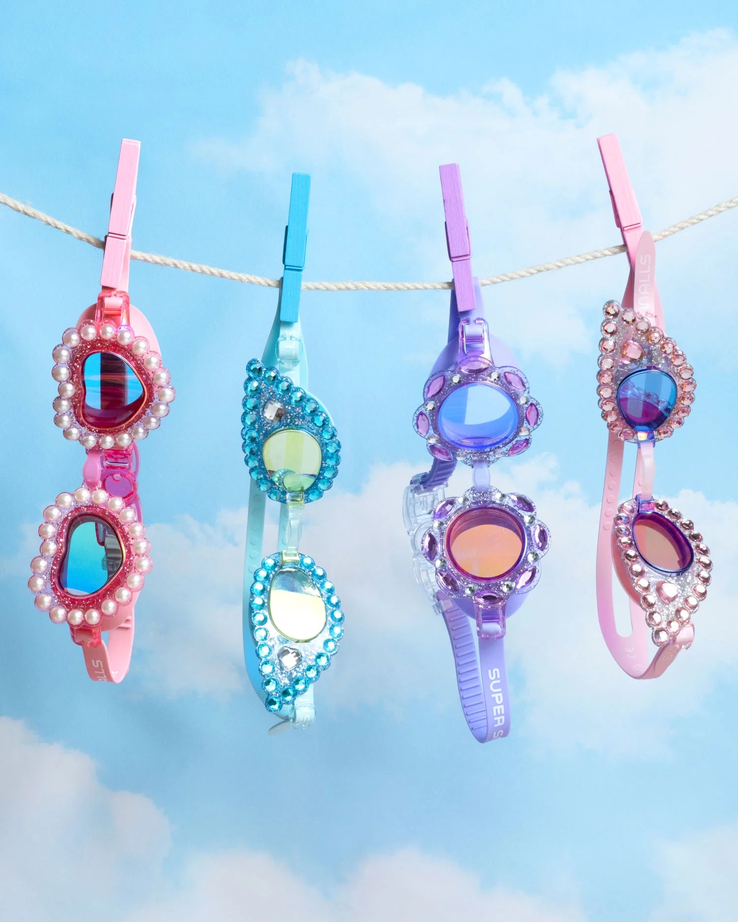 Get ready for serious heart eyes! The Heartfelt Super Goggles are bringing the love to swim time with heart-shaped lenses framed by sweet pearls and sparkles that make every dive feel like a dream. With a watertight seal to keep eyes dry, UV lenses and a clasp closure for easy on-and-off wear, they’re perfect for poolside posing, underwater adventures, and every splashy moment in between.