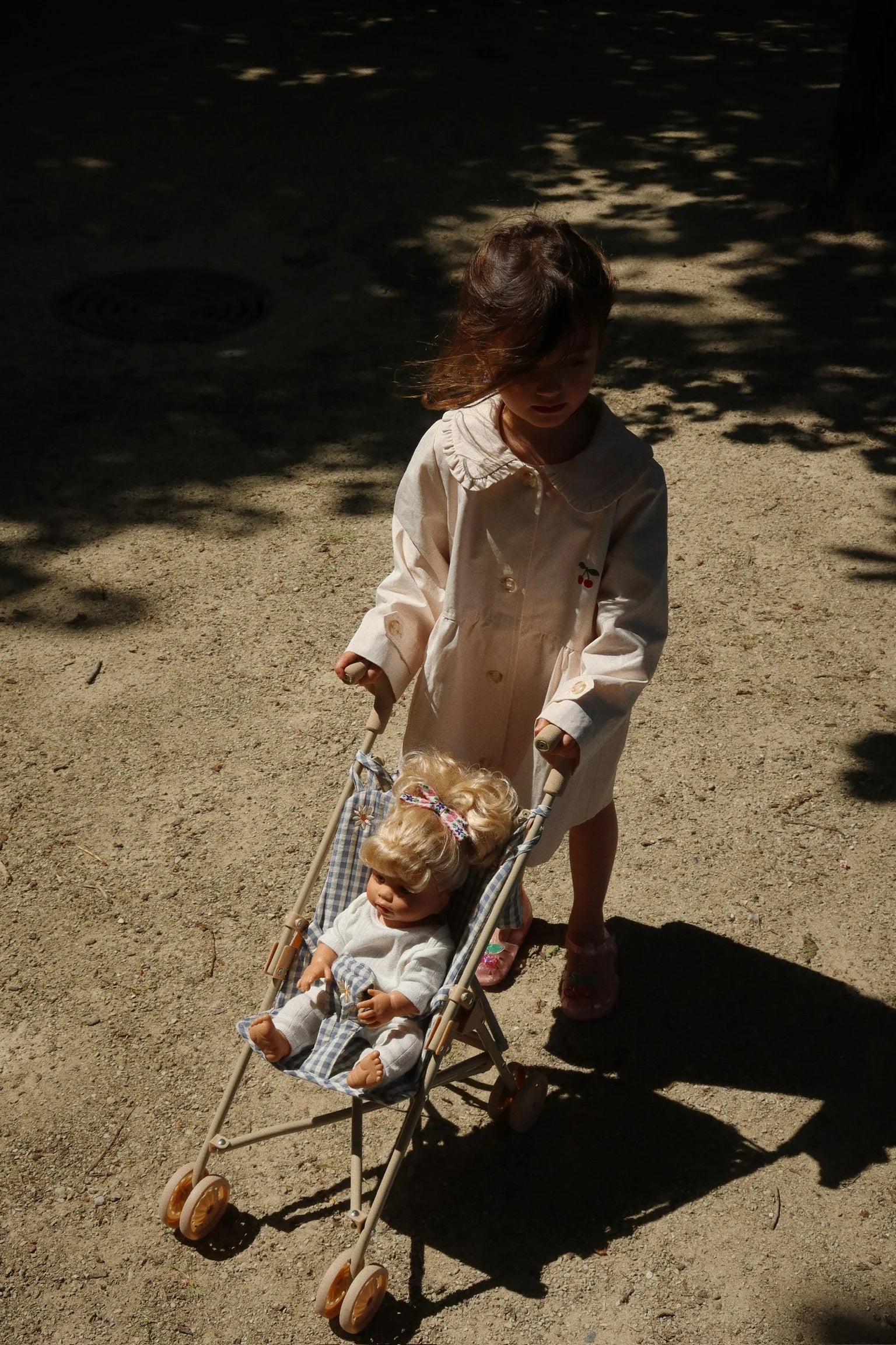 Sally is a sweet and cuddly doll with a vintage style hairdo and a soft two-piece cotton set. Includes a soothing pacifier for pretend play.