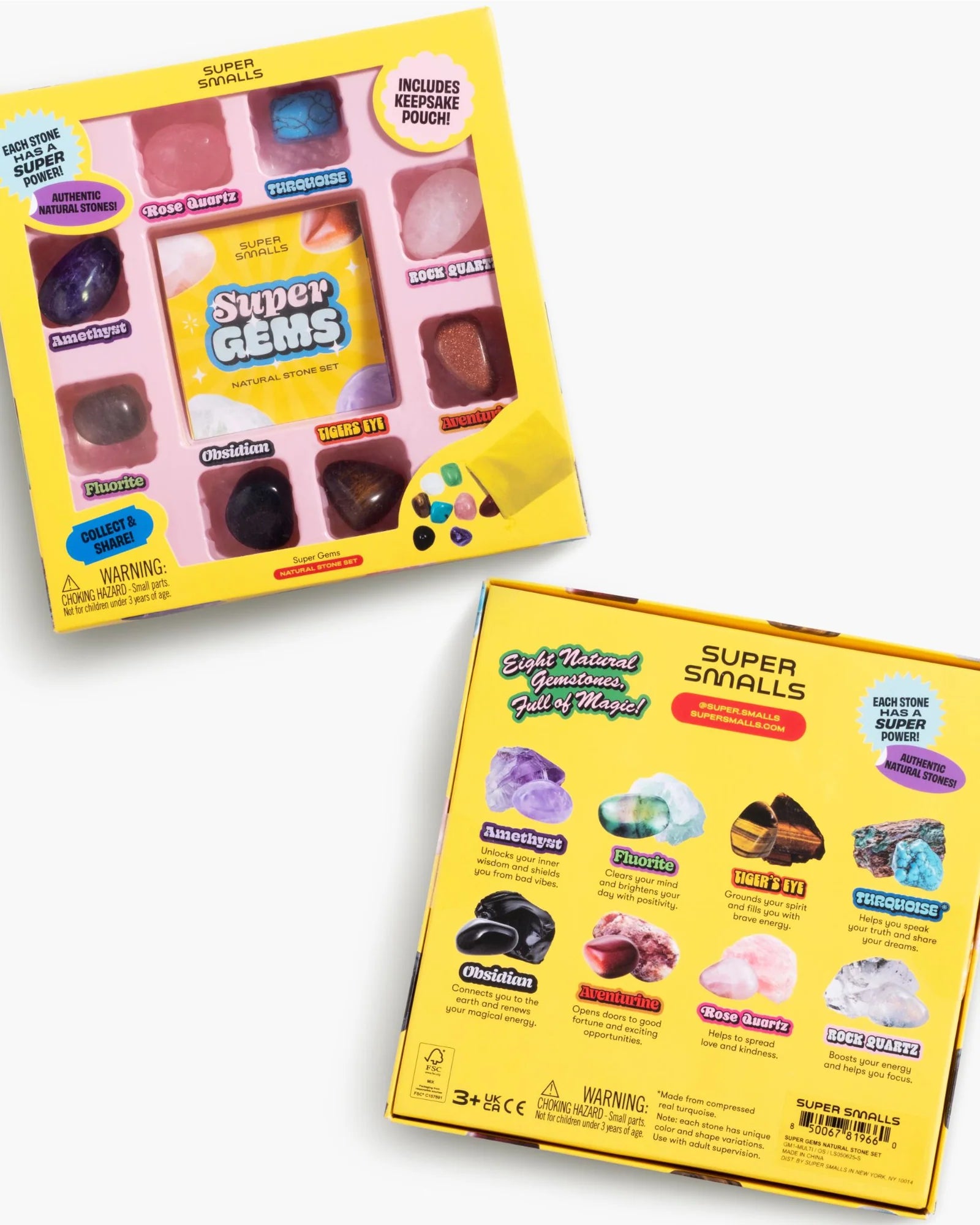 Give the gift of sparkle and strength. The Super Gems Natural Stone Set includes 8 real gemstones, each with its own unique “super power”—from courage to creativity to kindness. Inside the box, kids will find a bright yellow keepsake pouch for storing their favorite stones, plus a colorful booklet that explains the magic and meaning behind each one. It’s a hands-on way to explore nature, imagination, and everyday empowerment.