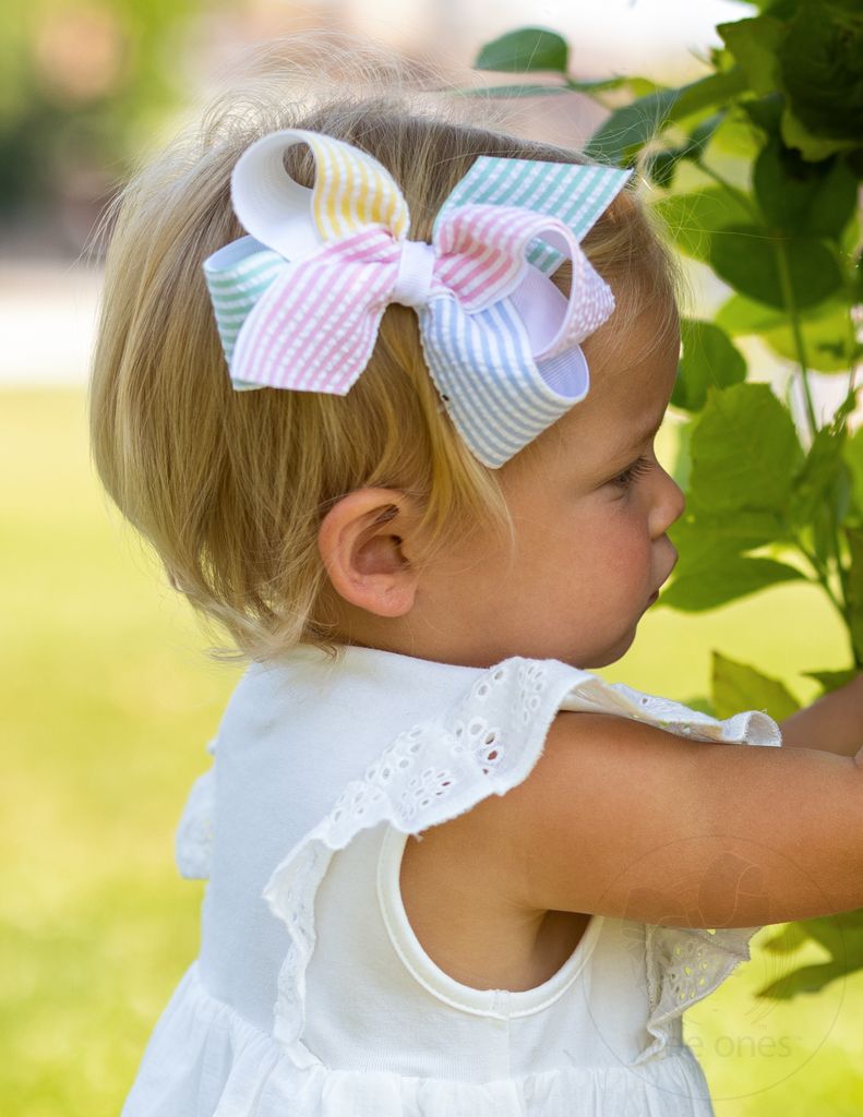 Add a touch of “spring and summer” flair to your little one’s wardrobe with this medium seersucker bow! Her mane will be full of style with this soft, pastel bow that looks oh-so-trendy and chic. Get ready to snap some cute pics! This bow is sure to stay in her hair all day with our patented WeeStay™ no-slip hair clip.