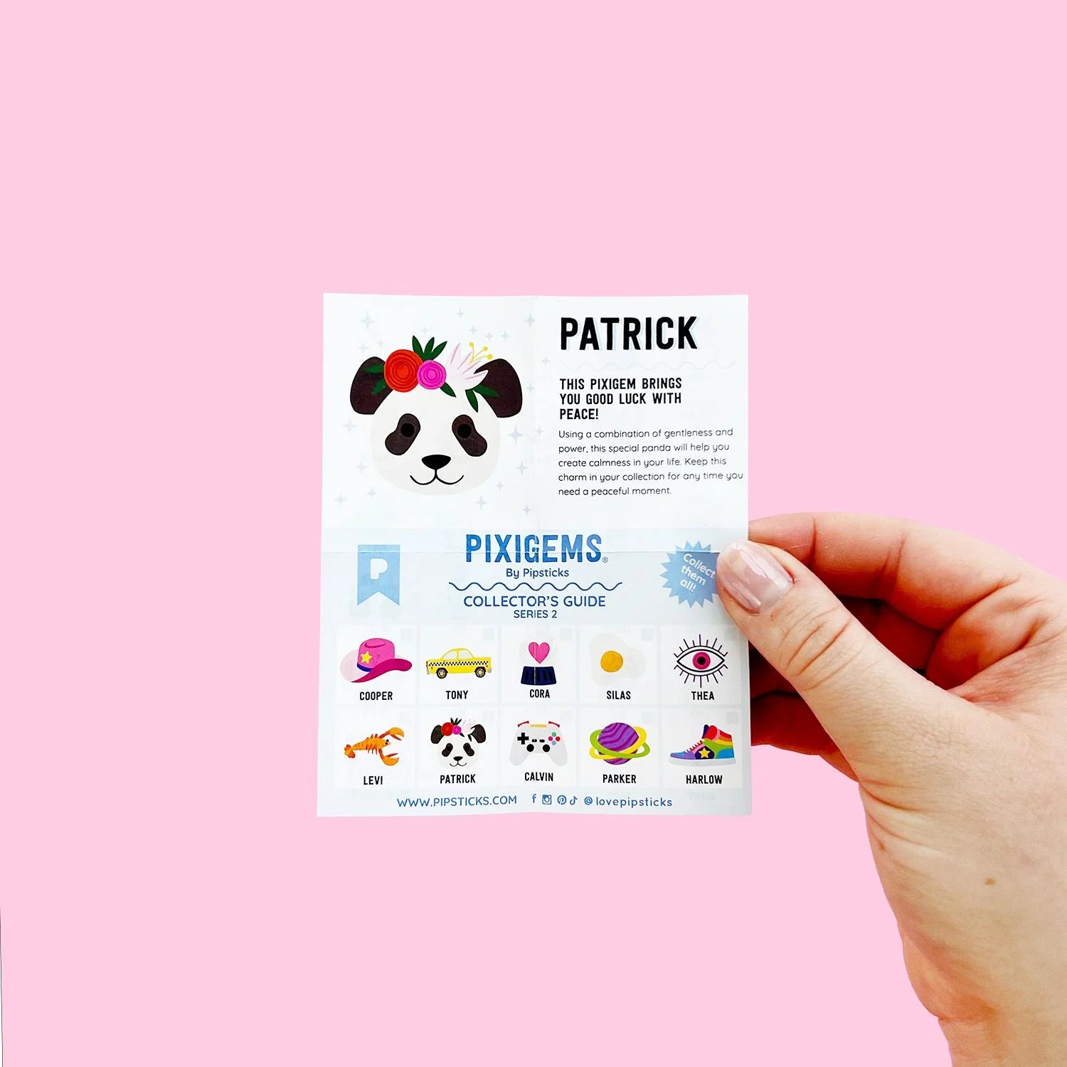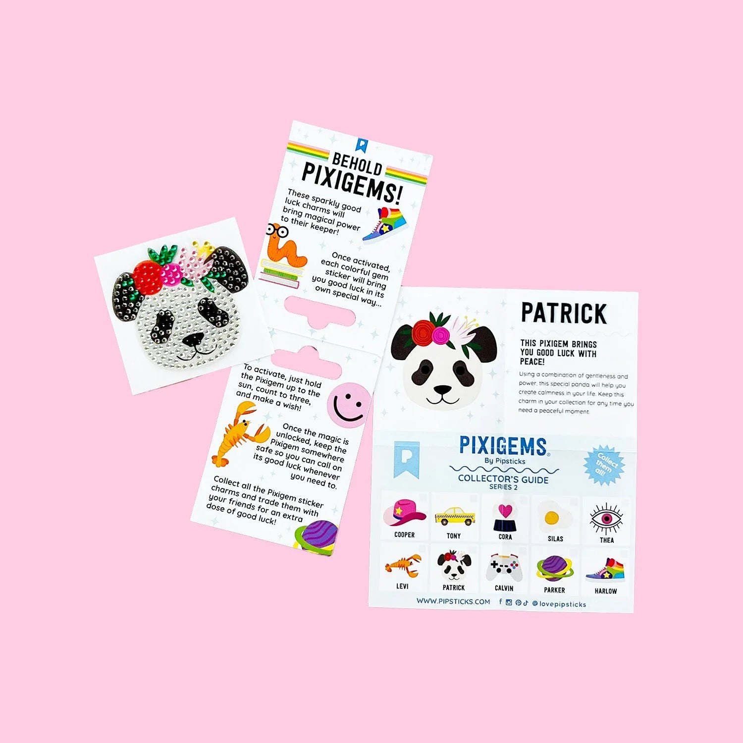 Includes one 2" x 2" Patrick Panda Pixigem sticker & collectors card to uncover it's special power.