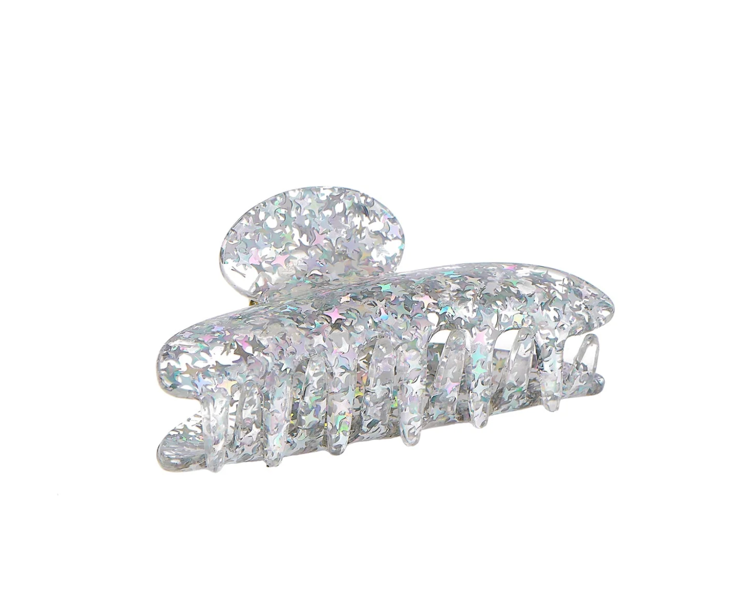 Designed with little ones in mind, our fun disco claw clip adds a touch of disco fever to any hairstyle! Made in acetate and adorned with shimmering stars, the little grippy teeth will hold hair in place whist little disco divas dance the night away!
