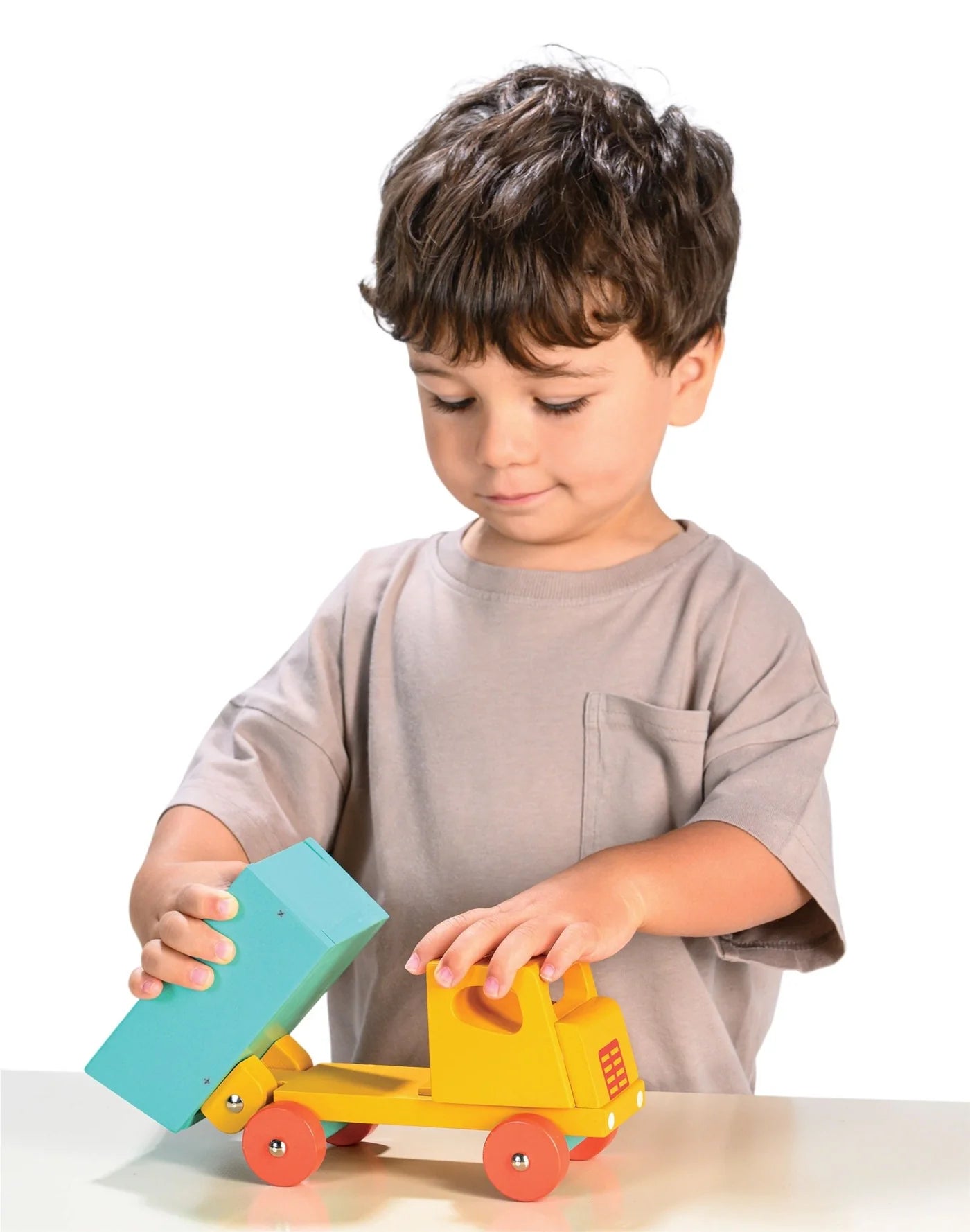 Based on a retro design, the simple clean lines give this traditional toy a refreshing look and feel. A classic big yellow lorry with tipping back part and orange wheels.
