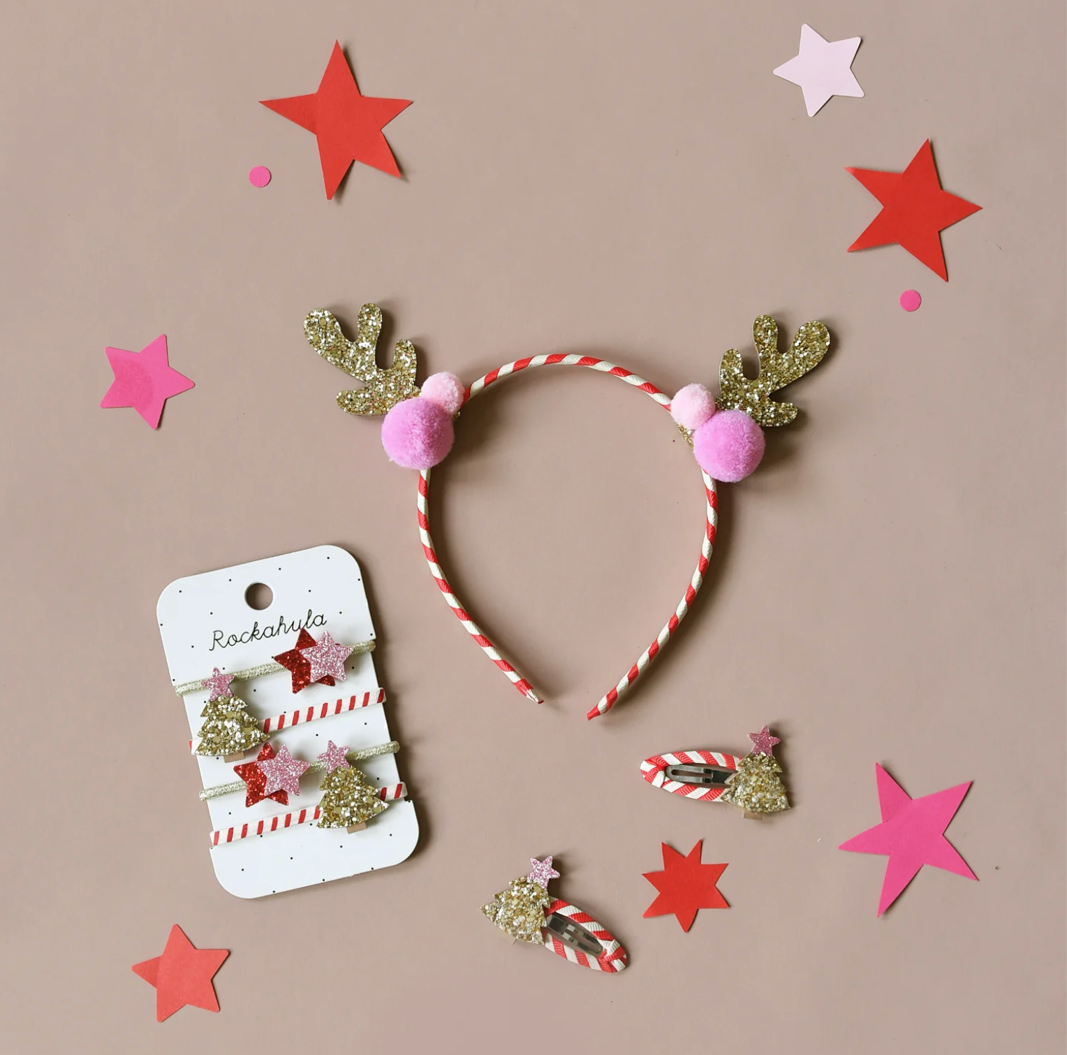 Sparkle your way through the Christmas season in these super fun Christmas tree clips! In chunky gold glitter, with pink glitter star toppers, each tree is secured to red and cream striped ribbon wrapped snap clips.