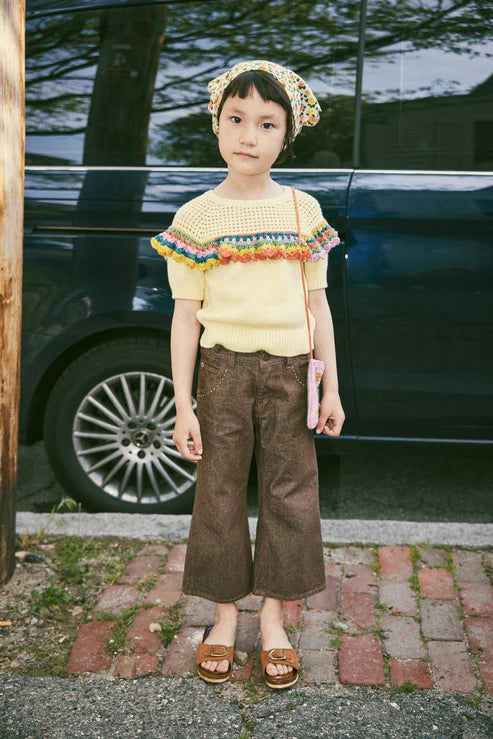 A short-sleeved top in Pima cotton, featuring an openwork yoke with an intricate, hand-crocheted striped multi-color scalloped edge, ribbed cuffs and hem, and keyhole detail at the back neck, secured with a corozo button.