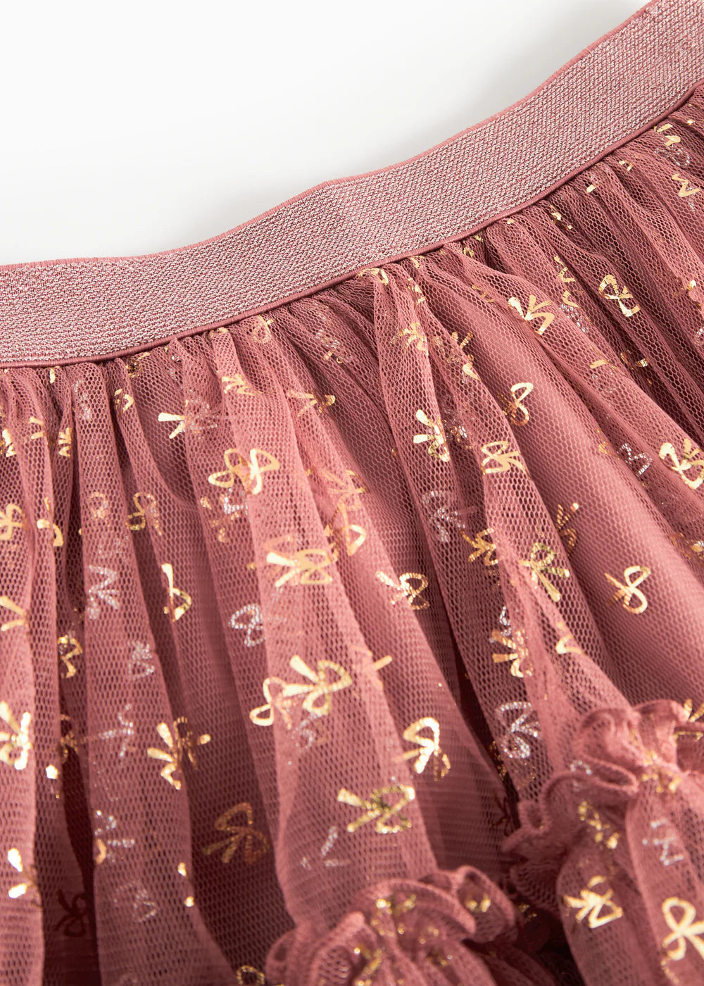 Ballerina skirt decorated with gold bows, elastic at the waist and many layers of tulle for volume. The length of the skirt goes above the knee.