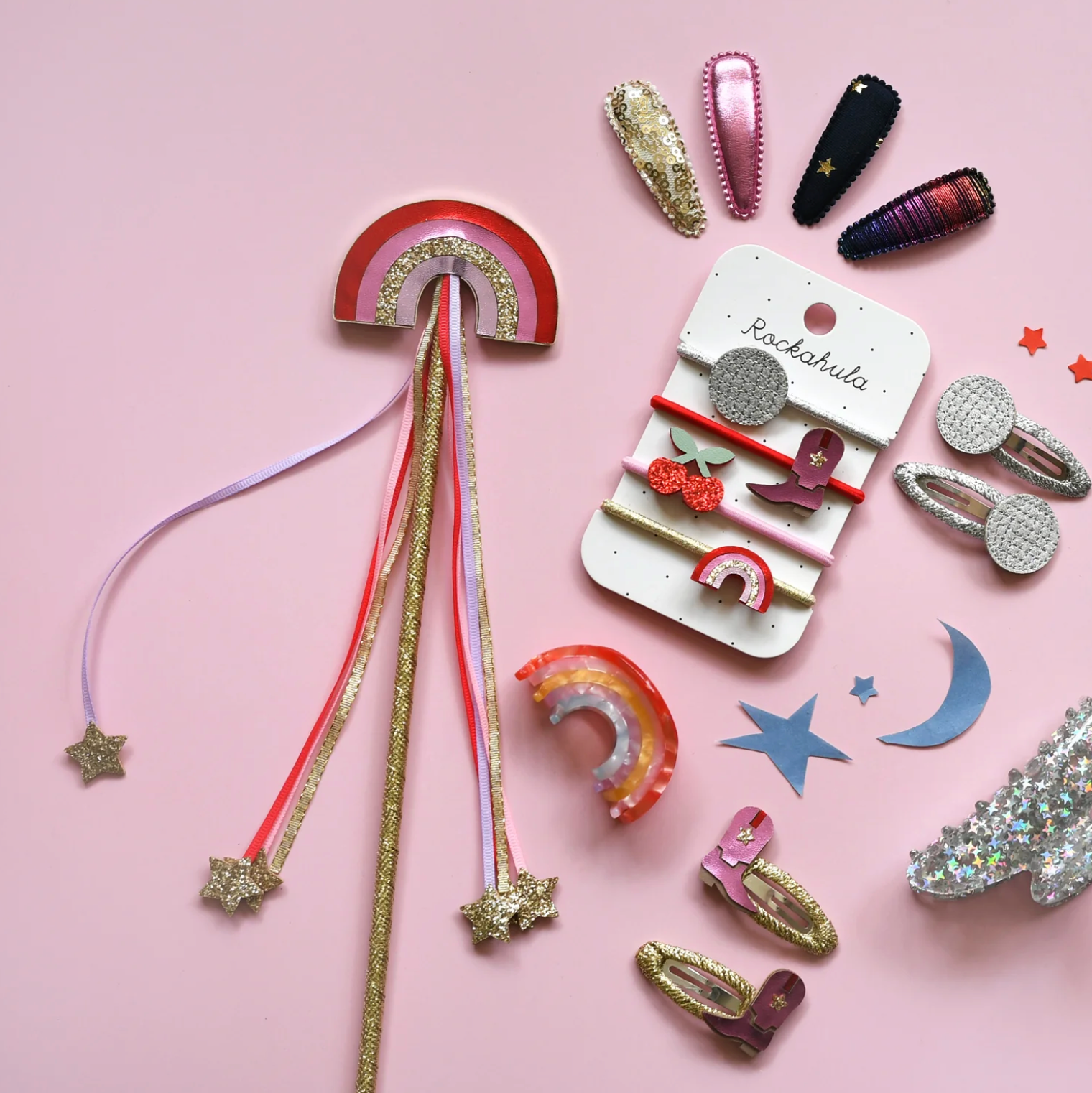 Yeehaw little cowgirls These shimmering pink cowgirl boots are made for little dreamers and rhinestone lovers! Two pink PU boots with gorgeous glitter detailing are sat upon gold ribbon wrapped snap clips. The perfect accessory to have you shining brighter than a Tennessee star!