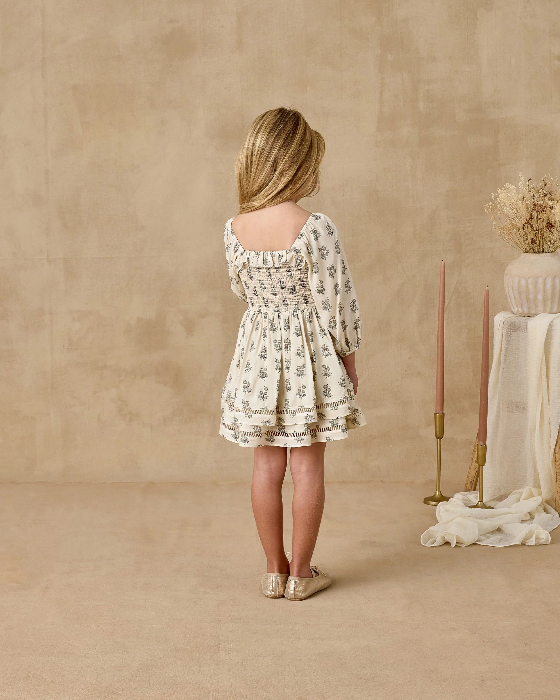 Our Elodie Dress delights with a smocked bodice adorned by delicate ruffle details, elastic balloon sleeves, and a layered skirt featuring charming lace trim inlays—perfect for twirling. Crafted from soft, breathable viscose, this flowing silhouette keeps your little lady comfortable and effortlessly elegant. Coordinating bloomers included with size 2Y.