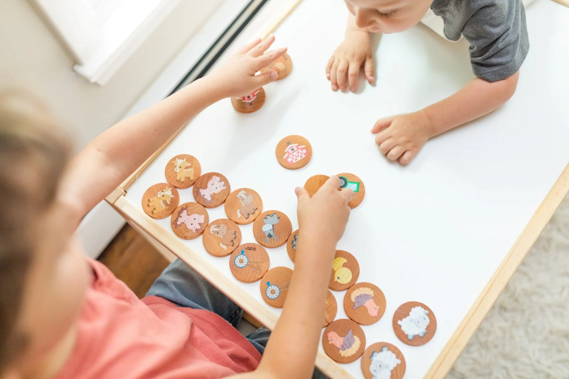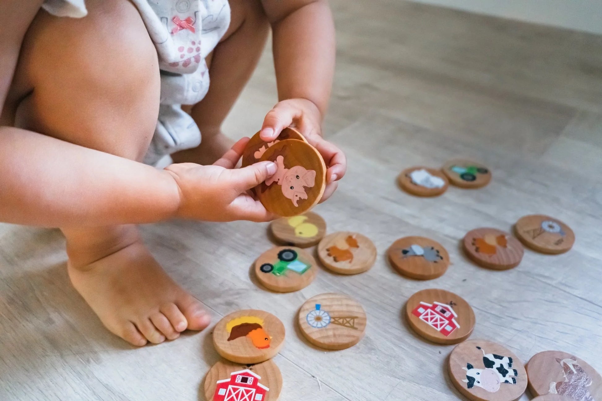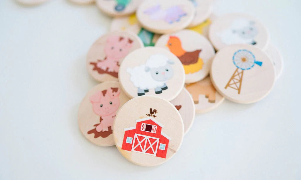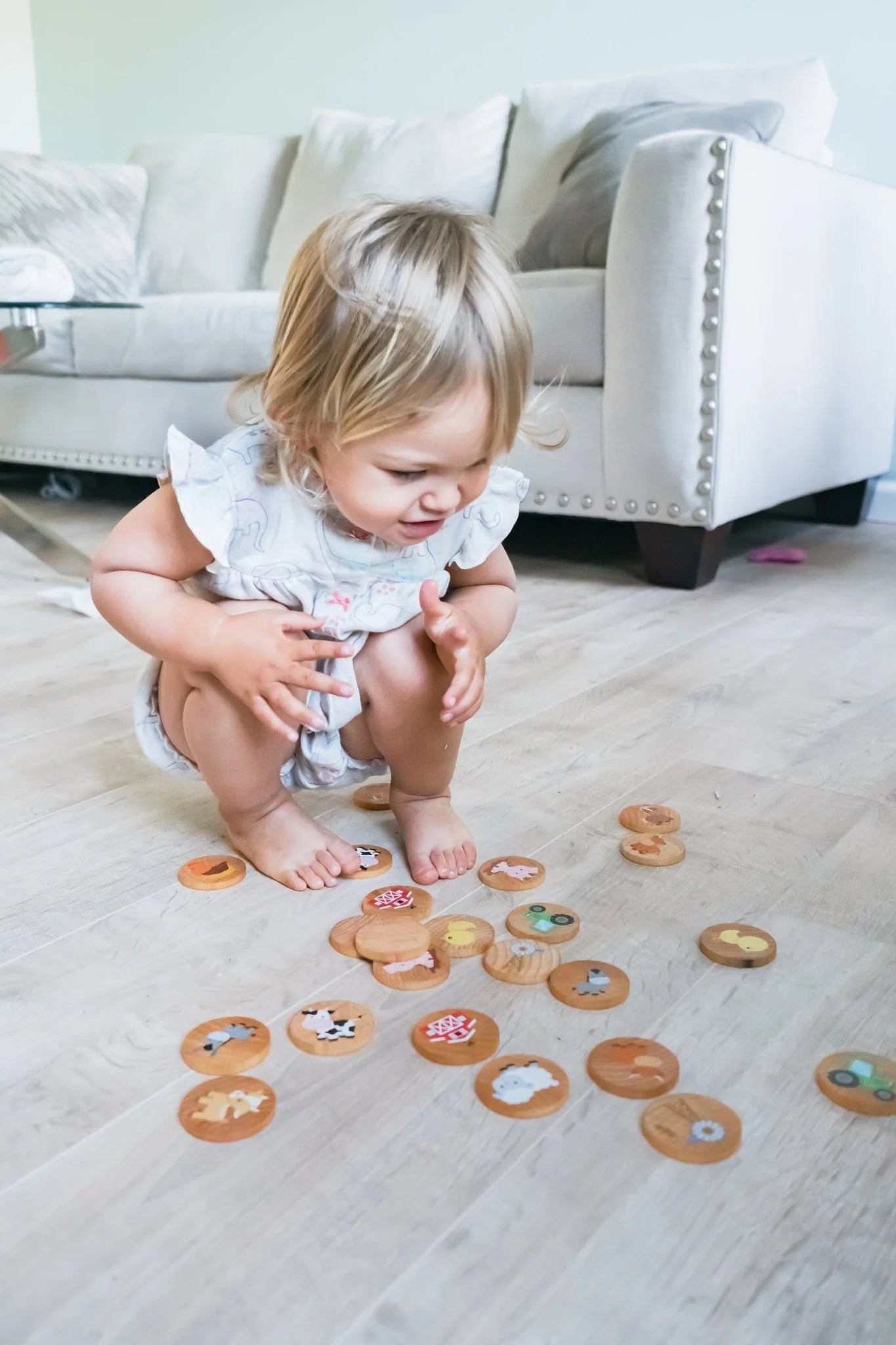 E-I-E-I-O! On The Farm memory matching game is here! This fun set is full of colorful animals, tractors, barns, windmills and all the fun things found on a farm! Use it as a seek and find game, use it to work on animal sounds, use it as a fun game that can be enjoyed solo or with the entire family - teaching kids to take turns and share with others. Our wooden matching tiles will also promote short term memory skills. This set features 12 pictures of easily recognizable farm items.