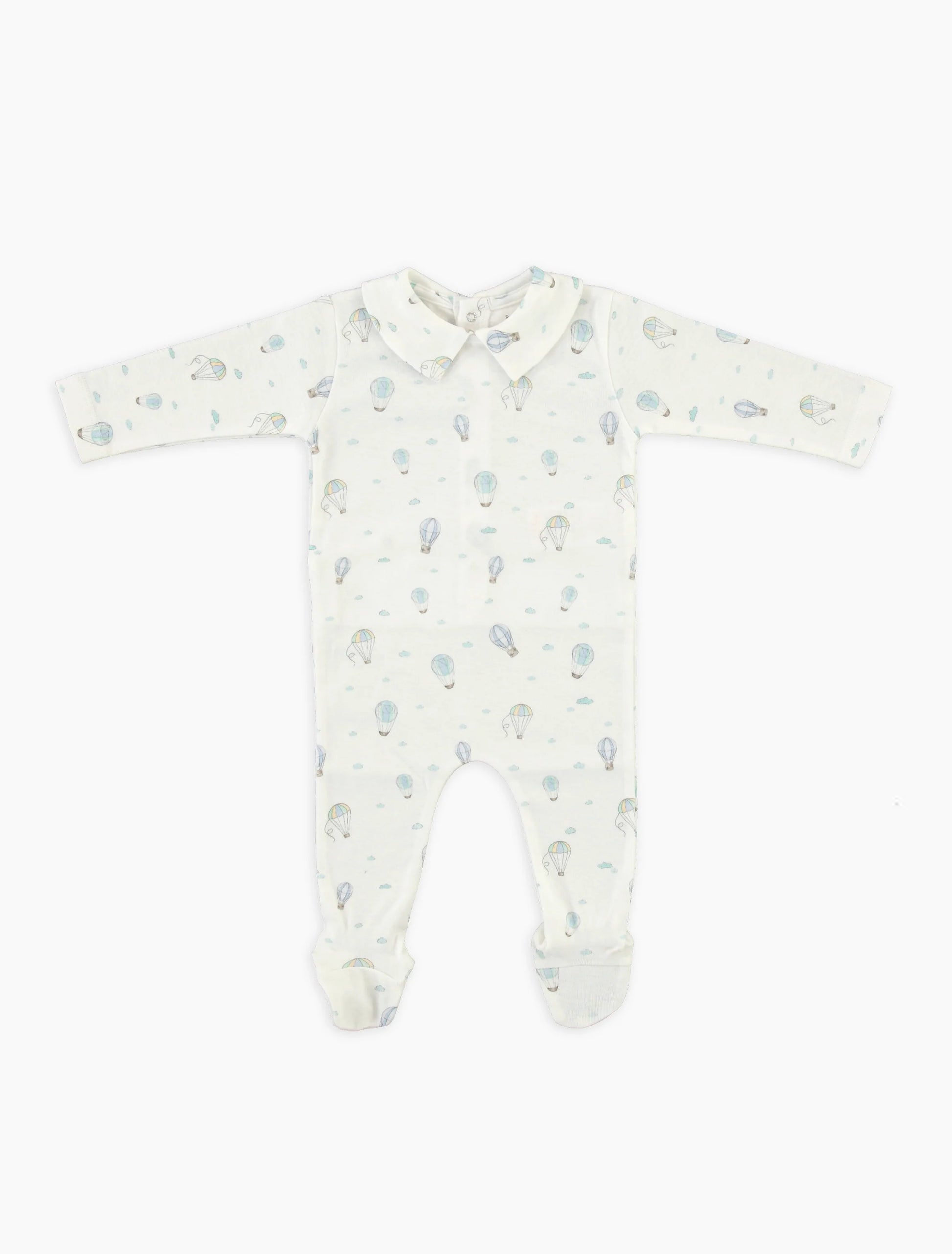 Adorable cotton essential line in the signature balloon print. The Finn Collar Overall combines comfort with timeless charm. Crafted from soft organic cotton, it features a signature all over balloon print and a classic Peter Pan collar. Long sleeves and covered toes add extra coziness, while back snaps make for easy changes. A perfect everyday piece—especially for newborns.