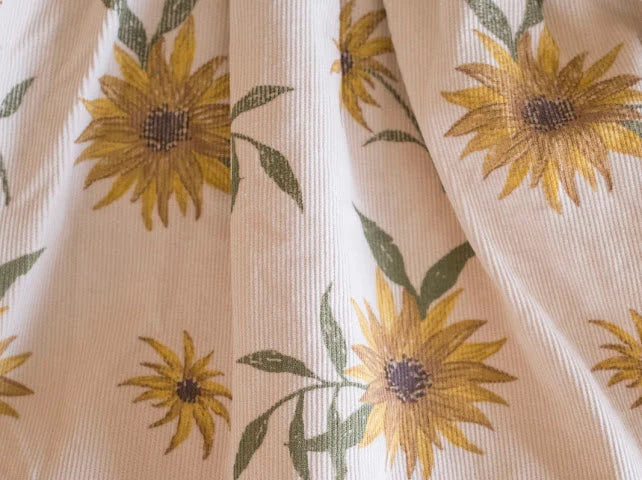 Custom-drawn sunflowers meet soft, worn-in corduroy
