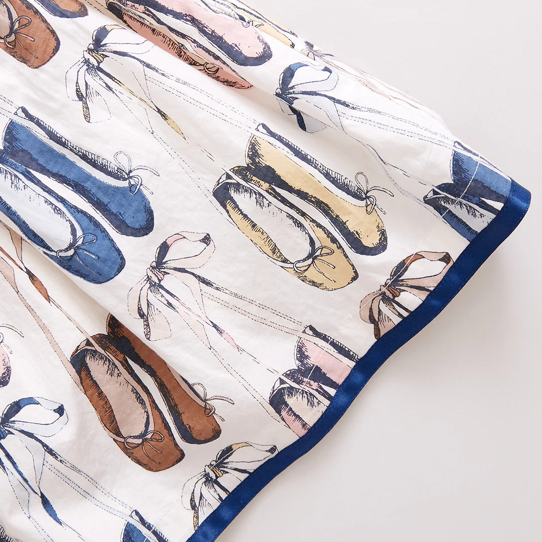 Straight To The Pointe! A cool palette of toe shoes dance across a crisp white ground on our long sleeve Girls Amma Dress shown here in Ballet Slippers. A fully gathered skirt trimmed with blue satin ribbon will get your pirouetting across the living room in no time! This sweet silhouette features a crewneck that dips slightly lower in the back and blue ruffle cuff detail at the sleeve. Zipper back closure. Twin with our Baby Girls Amma Dress Set for a sweet Big Sis / Little Sis moment.