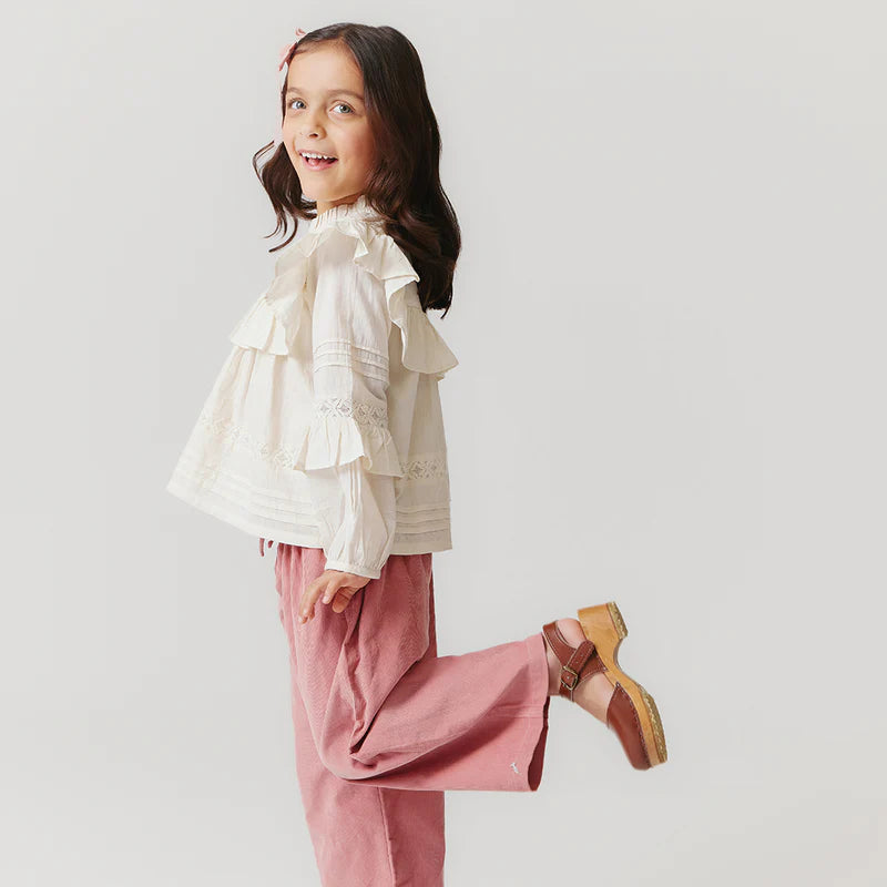 Prairie Chic! Our long sleeve Girls Mira Top, crafted in an Antique White 100% cotton cambric is chock full of designer details that will make you swoon. Generous ruffles at the chest, sleeve and collar, pintucks and lace throughout, and silver glitter buttons at the back are one of a kind accents that make this piece extra special.