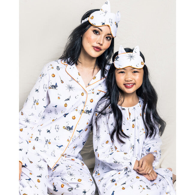 Step into a world of enchantment and mischief with classic Halloween icons that will ignite your festive spirit. Mischievous ghosts playfully float around, smiling owls beckon you with their glowing faces, while colorful candy corn adds a touch of sweetness. Our Trick or Treat print echoes all of the nostalgia and excitement of All Hallow’s Eve, transporting you back to magical nights of childhood. The Delphine Nightgown whispers of yesteryear with its sweet tie accent on the chest and angelic bell sleeves. This nightgown is a very soft twill. The sleepwear is made from the finest quality cotton and blended with just enough inherently flame retardant fiber to allow it to pass strict CPSC flame retardant laws without using harmful chemicals. This twill feels absolutely luxurious and gets cozier after each wash.