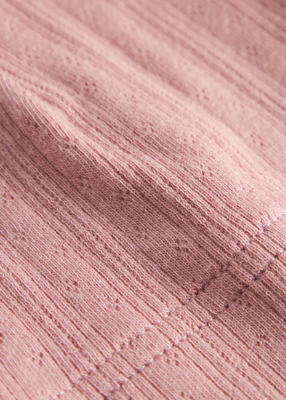 Small pointelle hat for newborns with a brim that can be folded up or down. The hat is soft, stretchy and comfortable to wear.