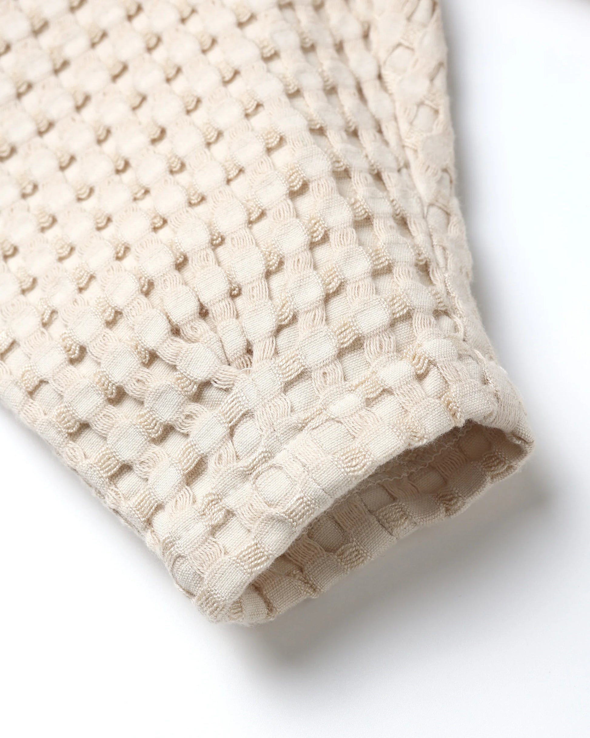 Made from our chunky waffle knit, our Hayes Jumpsuit features short sleeves, full-length tapered legs, and coconut buttons down the front—perfect for in-between weather.