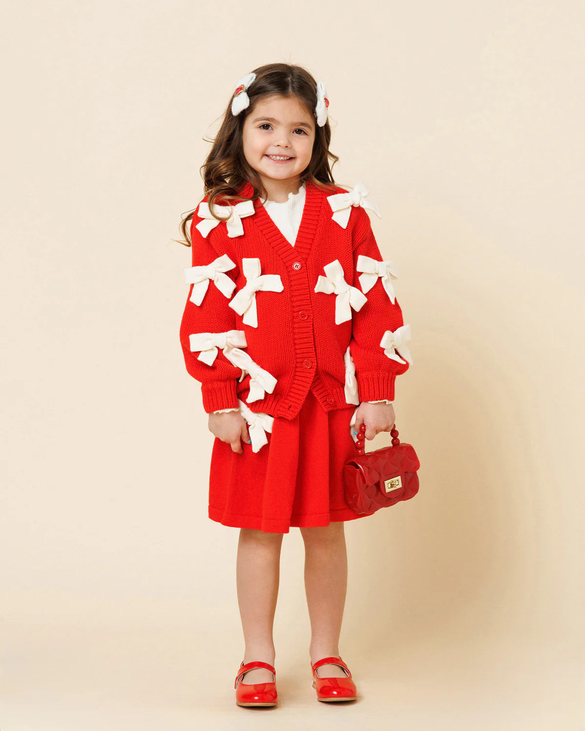 Cozy meets cute in the sweetest way. The Knit Bow Cardigan is crafted from soft, warm knit fabric and detailed with delicate pink bows for a playful touch. Classic navy buttons add timeless charm, making it perfect for layering over dresses or pairing with the matching Knit Bow Skirt. Whether it’s for school days, family outings, or just a little extra polish, this cardigan wraps her in comfort and style all day long.
