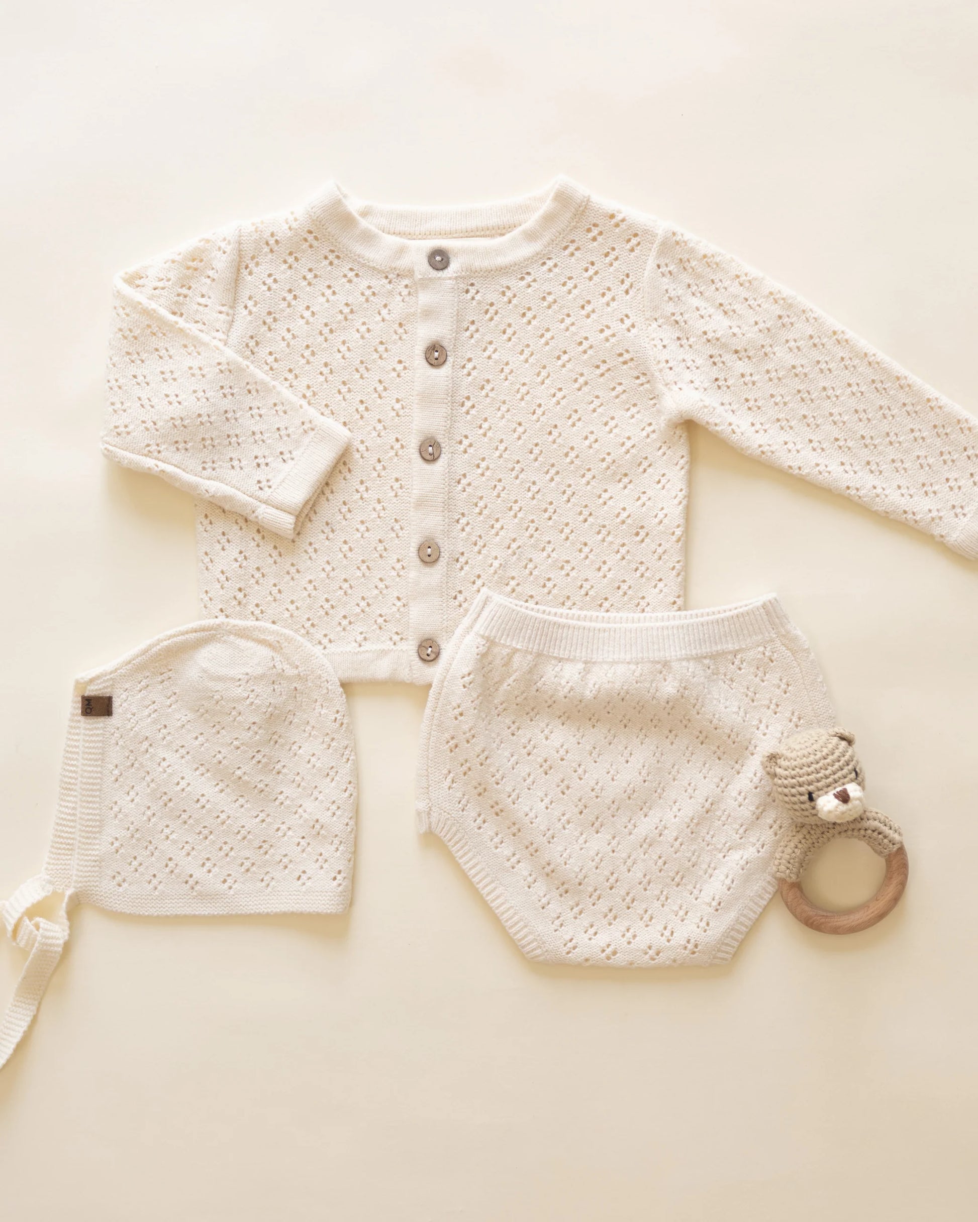 This darling cardigan showcases a beautiful pointelle knit design and coconut buttons for an extra sweet look.