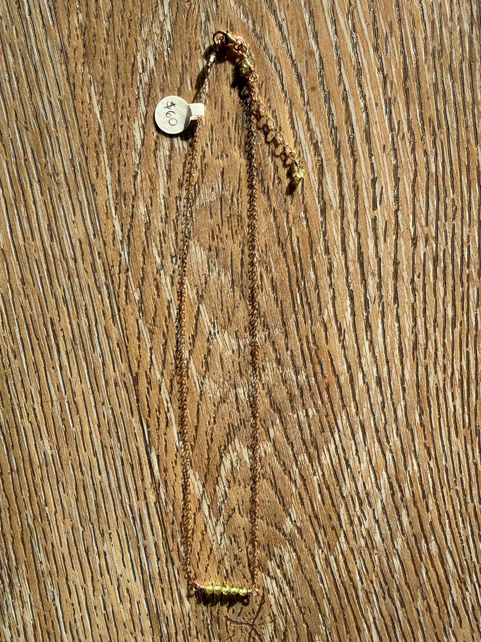 Elevate your everyday elegance with this stunning peridot necklace, crafted in lustrous 14k gold-filled chain. The luminous green peridot beads catch the light beautifully, adding a touch of natural sophistication to any outfit. Adjustable from 16" to 18", this versatile piece transitions seamlessly from casual days to special occasions. Perfect for layering or wearing solo, it's a timeless investment that brings warmth and radiance to your jewelry collection.