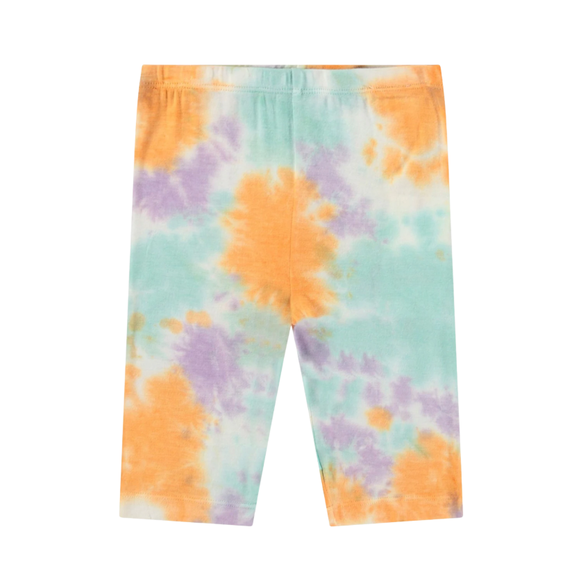 Multicoloured tie-dye cycling shorts in stretchy soft viscose. The shorts are form-fitting, go down to the knee, have an elastic waistband, making them easy to put on and comfortable to wear. Pair them with a matching top for a complete set.Please note that all our tie-dye is handmade, creating a unique pattern that varies from style to style.