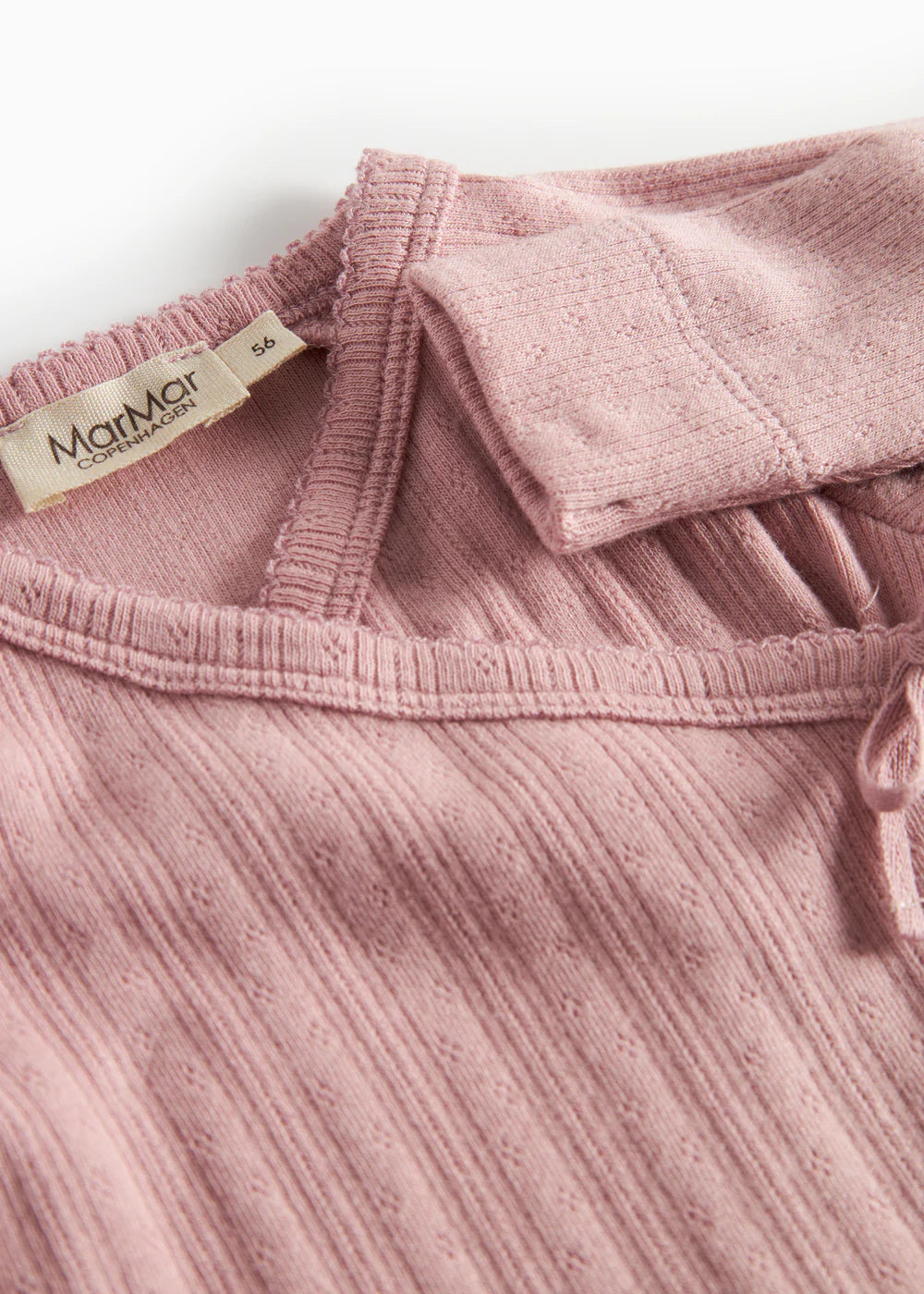 Long-sleeved pointelle onesie with feet for newborns. The onesie has a wrap-around closure, picot edges and closes with snaps and ties from the neck down one leg. The onesie is soft, stretchy and comfortable to wear.