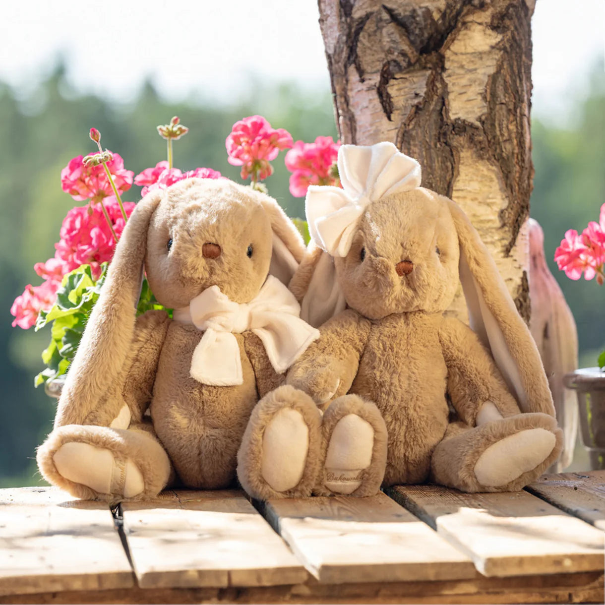 Patrick has an ultra-soft, brown coat and a big white bow around his neck, making him the perfect companion for a sophisticated young fellow. He is a great cuddler because of his long ears. Patrick looks extra cute next to his sister, Gabrielle!