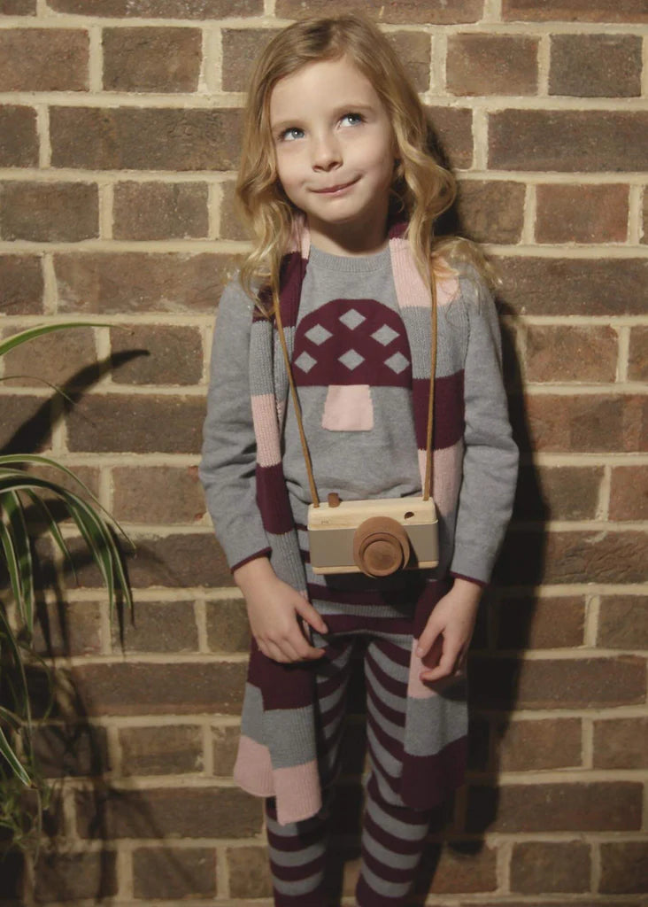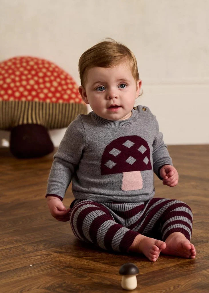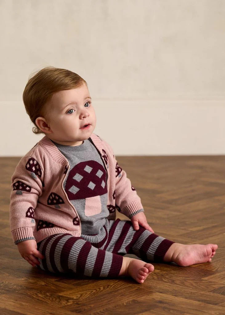 Super soft rib knitted baby & toddler leggings in a two-tone maroon and grey stripe with adjustable waistband. Made from our most popular feather soft cotton-cashmere winter yarn which is now made with sustainable Organic Cotton! Expertly knitted using a ‘fully fashioned’ technique that minimises wastage. Pair with our selection of knitwear for a super soft and cosy winter baby outfit.