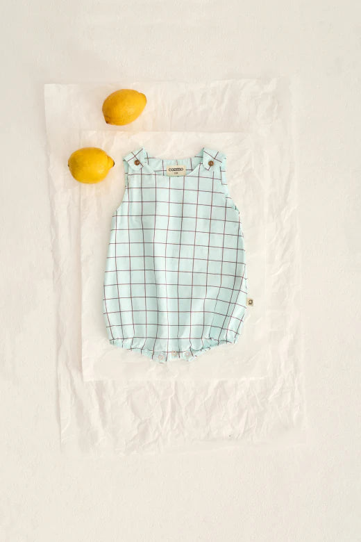 Baby and toddler plaid romper in light poplin cotton. It features front-button straps, snap buttons at the gusset, and elasticized leg openings for a snug, comfortable fit.