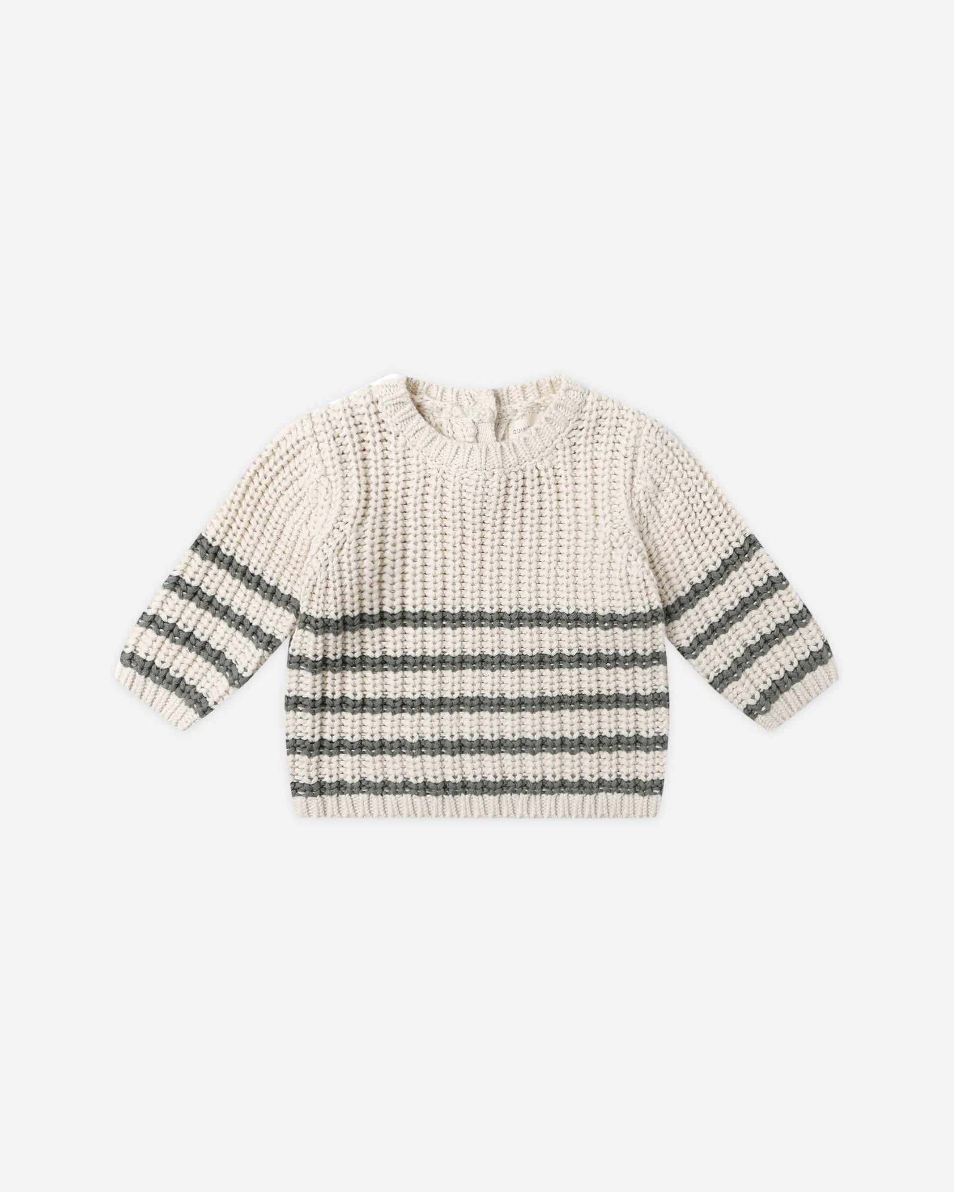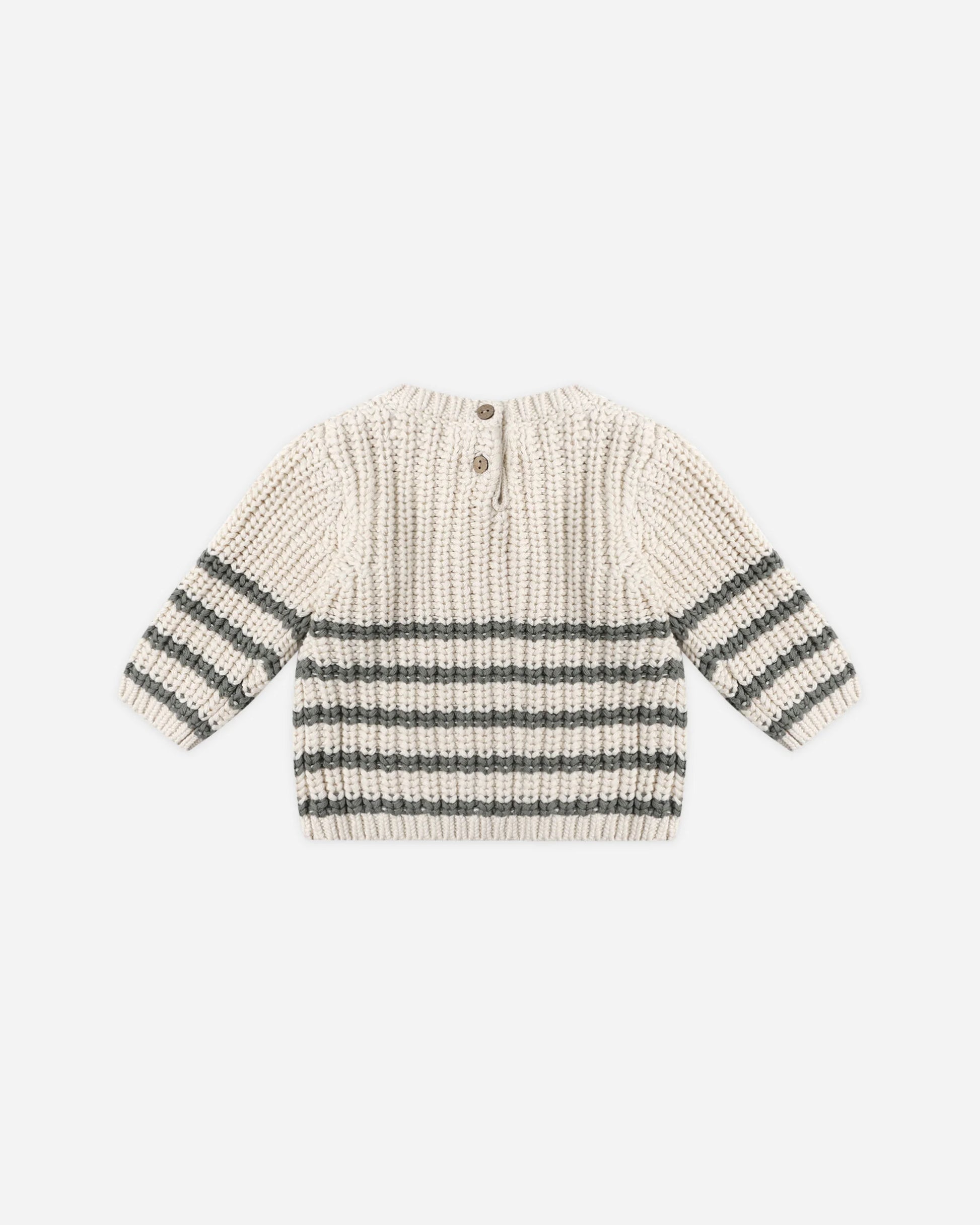 Cozy and chunky, our Rex Sweater features ribbing at the neck, cuffs, and hem, plus a back button placket for easy changing.