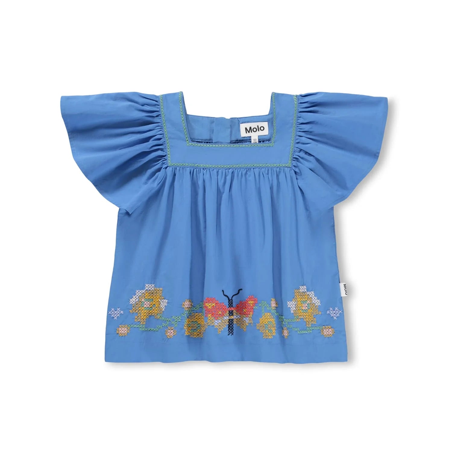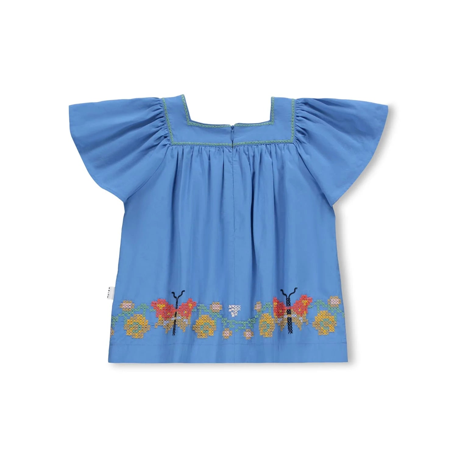 Blue shirt made of soft cotton with a square neckline and butterfly sleeves. The shirt has an invisible zip at the back which makes it easy to put on and off and it has a colourful butterfly embroidery around the edge.