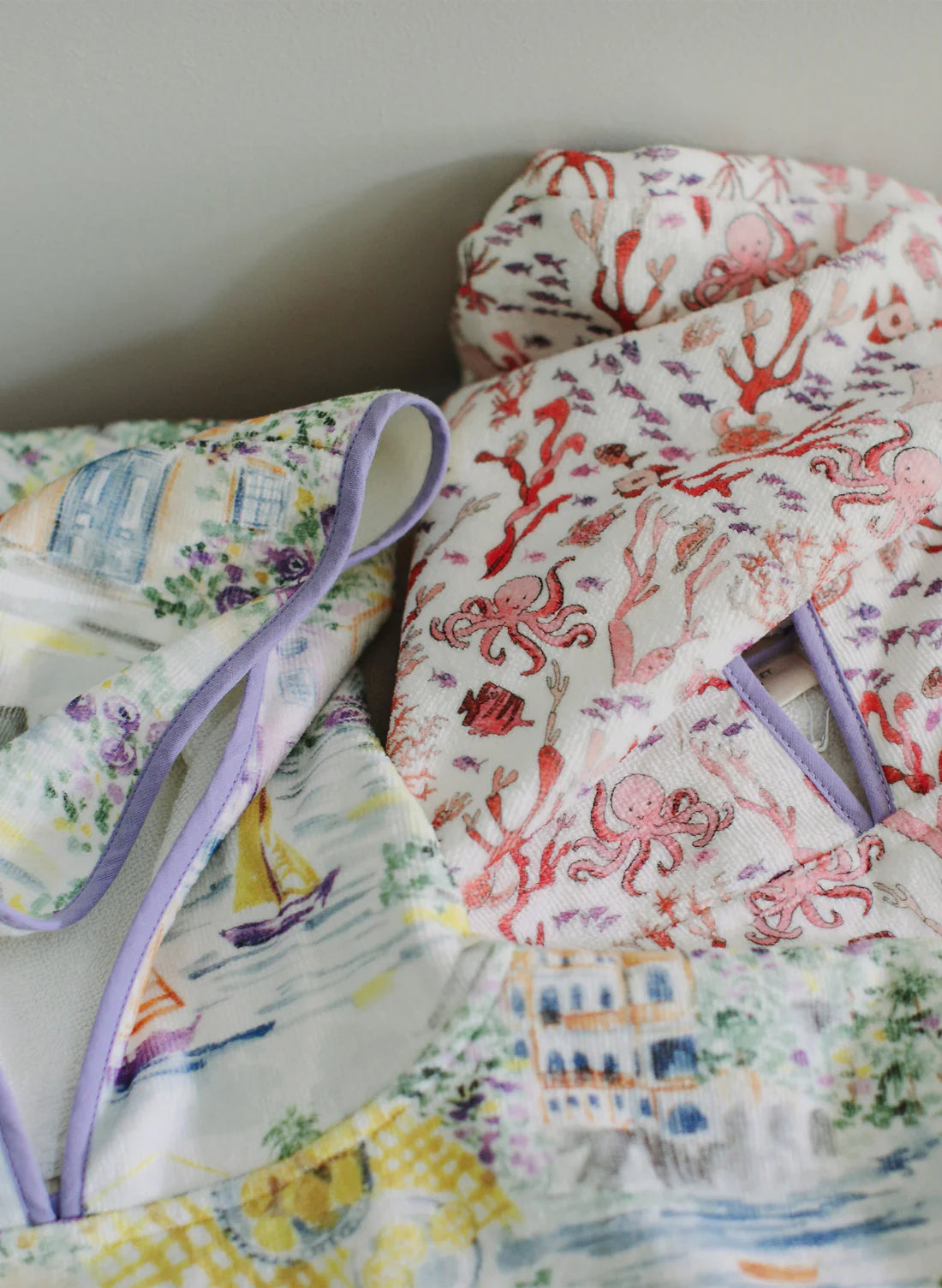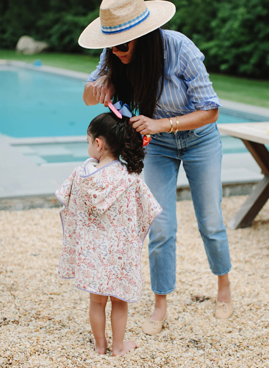 Keep your little one cozy after a swim at the beach, pool—or even bath time!—with our ultra-absorbent organic cotton terry swim poncho. Designed in our new feminine Rosy Coral Reef print and sized for ages 18 months to 4 years, it’s as practical as it is playful.