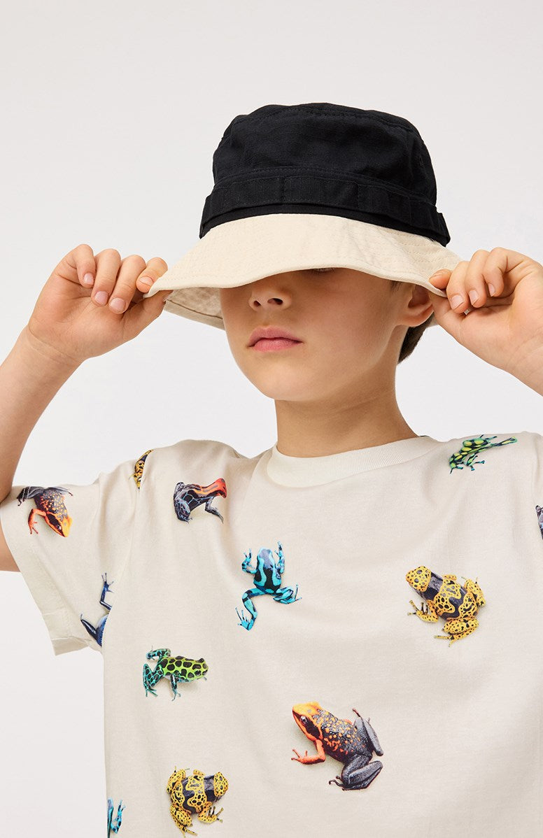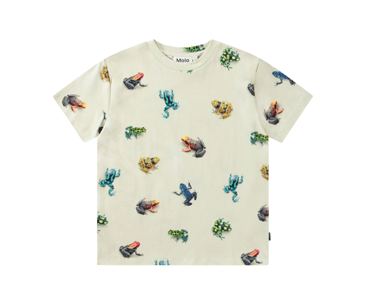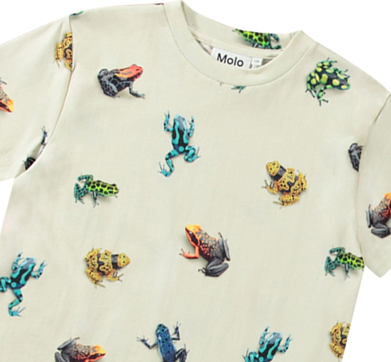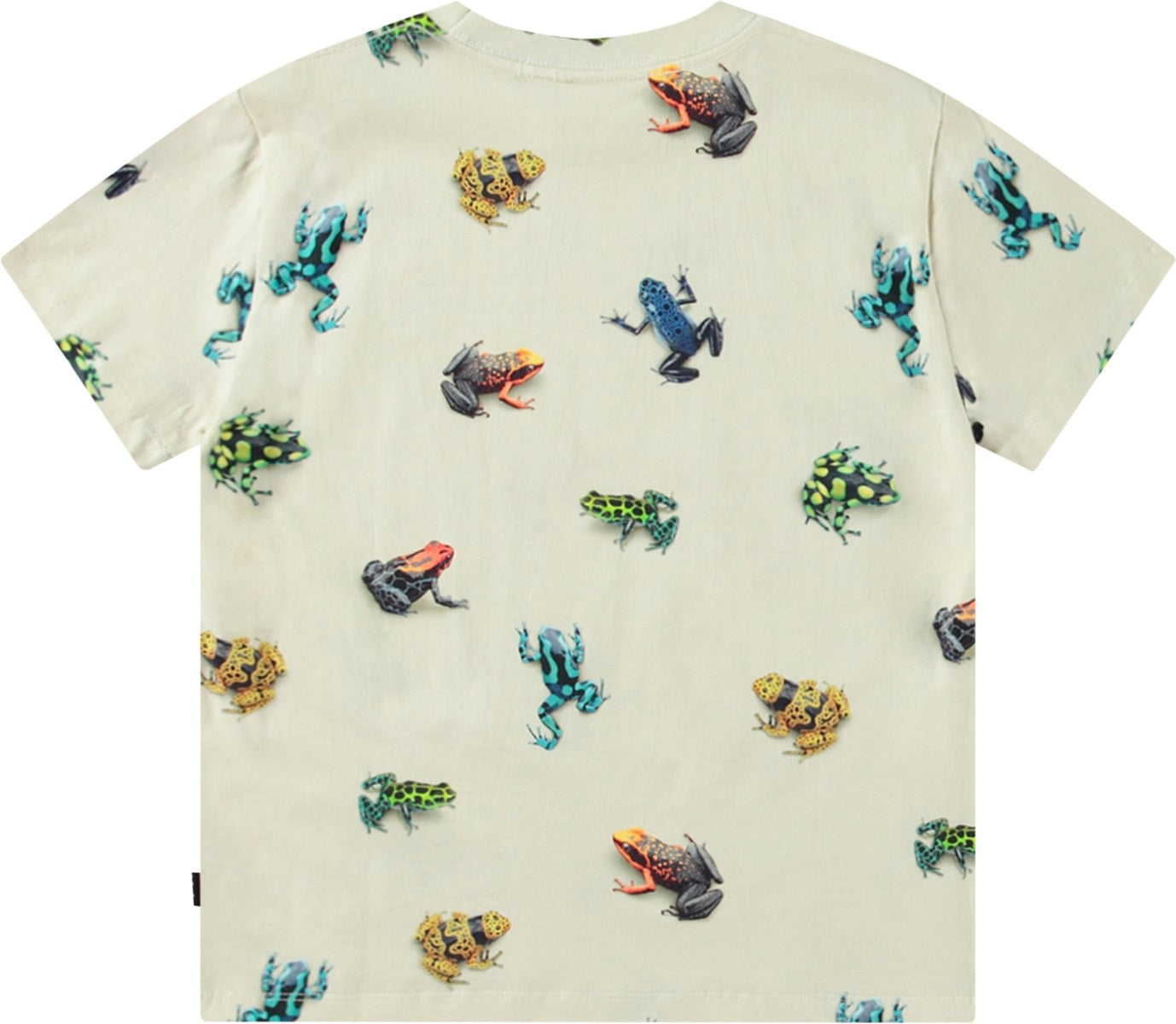 Off-white t-shirt in organic cotton with short sleeves and ribbed neckline. The t-shirt has a loose fit with an all-over print of colourful frogs.