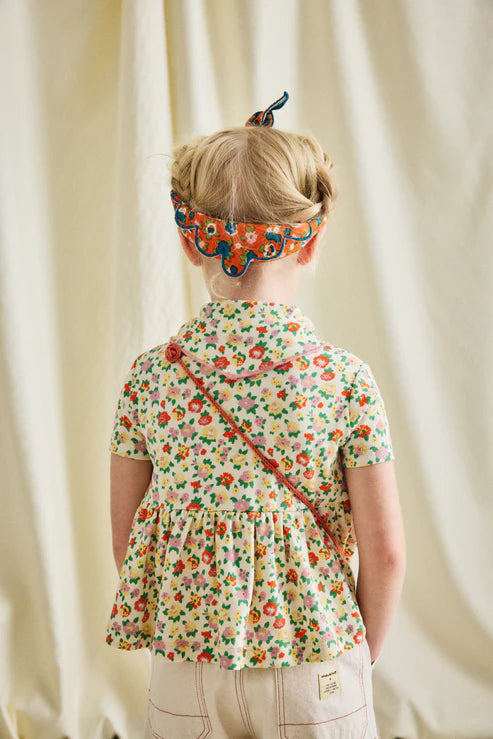 Inspired by Misha & Puff’s signature Scout Top, the new Scout Peplum Top is a peplum top in Pima cotton, with short sleeves and the Scout pull-through kerchief with additional soft pointed collar with a contrast merrowed edge.